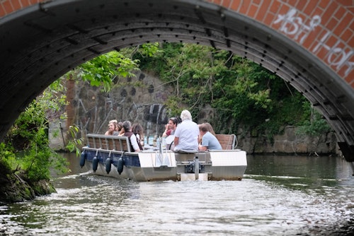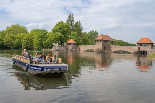 Genießen Sie die schöne Flusslandschaft der Weißen Elster und des Karl-Heine-Kanals. Bei dieser Tour lernen Sie Leipzig von einer Seite kennen, die nur wenige zu sehen bekommen. Mitten durch die Stadt schwebend, erleben Sie die Natur neben jahrhundertealter und moderner Architektur. Ihre Tour beginnt am zentral gelegenen Leipziger Stadthafen. Von dort aus geht es an Bord eines Motorbootes zu einer 70-minütigen Sightseeing-Tour zu den historischen und modernen Sehenswürdigkeiten Leipzigs entlang des Ufers. Entdecken Sie die Villa der berühmten Familie Baedeker, fahren Sie zum Palmengartenwehr, einem wichtigen Teil des Leipziger Hochwasserschutzes, erkunden Sie den Westteil der Stadt und genießen Sie einen kurzen Moment der Stille, während Sie die umliegende Natur bewundern. Anschließend können Sie die beeindruckende Architektur der Buntgarnwerke, einer ehemaligen Garnfabrik aus dem späten 19. Jahrhundert, genießen. Jahrhundert, und schließlich der Karl-Heine-Kanal, einer der malerischsten Orte der Stadt.