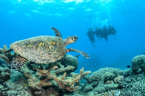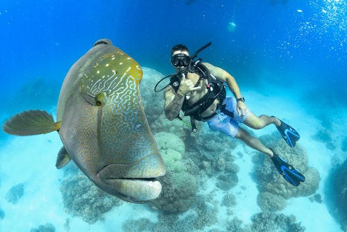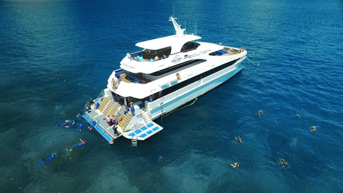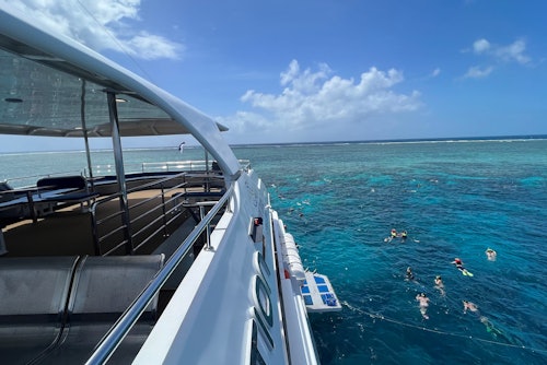 There's no better way to see the world's most famous reef than from the water! This full-day tour takes you out into the crystal blue magic of the Great Barrier Reef, where you'll spend a sunny five hours in two unique outer reef locations, teeming with ocean life to explore. * Snorkel and swim – there are so many fish, you won't believe your eyes. Or just relax on the loungers of the 35-metre luxury superyacht. Then it's time for a BBQ lunch on the deck with fresh fish, prawns, steak, veggie options and fresh salads to refuel you. A glass of wine is included, and the bar is always open for more. * Note: Admin/fuel levy of AU$20 per person to be paid on board.