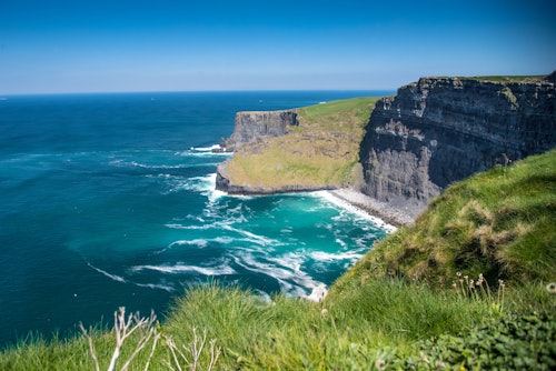 Leave Galway behind for the day during this fully-guided tour to the Cliffs of Moher and Burren. * As you travel through the Burren, listen to your expert driver-guide tell tales of Galway and the surrounding area's rich history. * You'll step off the coach into windswept landscapes at the Cliffs of Moher. You'll be left speechless by their staggering beauty, standing 700 feet tall and stretching along eight kilometres of the Atlantic coast. * Take time for yourself to explore the walking paths along the most outstanding landscape in Ireland, seeing exposed limestone terrain, jagged cliffs, and the untamed Atlantic Ocean as you go. There's also time to pop into the official visitor centre. * Alongside the cliffs, you'll see Dunguaire Castle (Kinvara), Aillwee Cave, Lisdoonvarna, Corkscrew Hill, Doolin, and Blackhead Lighthouse.
