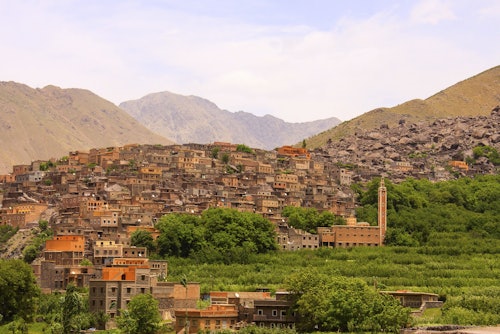 Visit Toubkal Massif, a national park with rugged peaks and deep valleys. Toubkal holds the highest summits in the Atlas Mountains. Roads are busy with people, animals, scooters, and trucks. Exit at the small village of Imlil, the entry point for the Toubkal area. * Go on a 20-minute hike to a restaurant for lunch facing Mount Toubkal, which stands at 12,700 feet. It is the second-highest summit in Africa after Kilimanjaro.