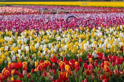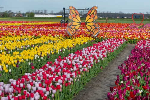 It's Instagram-heaven at The Tulip Barn. Can you spot all 175 different tulip varieties? * In the heart of the Bollenstreek, The Tulip Barn is the most picture-perfect place for skipping into spring - a giant garden with a blooming brilliant array of tulips! The newest flower attraction in the region puts you right in amongst almost 200 varieties of tulip without bothering the local growers! * Crouch, stand and skip around them, and take as many photos as you like with the awesome props. From a golden cow to a piano, however you want to pose with the tulips, there's a prop for you! * Afterwards, why not get something to eat and drink in the greenhouse, or out on the sunny terrace, with a beautiful view over the tulip fields? Children can play outside too. As a bonus, you can buy the freshest tulips to take home with you!