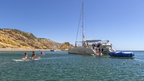 There’s no better way to discover Portugal’s dramatic coastline than from the ocean. * During this half-day catamaran cruise you’ll sail from Lagos Marina to Burgau and back. Along the way, you’ll pass by famous beaches like Praia Dona Ana and Praia do Camilo, as well as stunning grottoes at Ponta da Piedade, Canavial, and Porto de Mós. Make sure to also keep an eye out for the black rock of Praia da Luz while you sail. * You’ll drop anchor at the fishing village of Burgau and enjoy a healthy lunch before spending time doing aquatic activities like stand-up paddle boarding, snorkelling, and taking on an inflatable, bouncy water park. * Once you’ve filled your stomach and had a splash in the water, grab a cocktail back onboard and dry off in a sunbathing net as you cruise back toward Lagos.