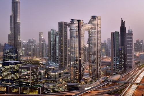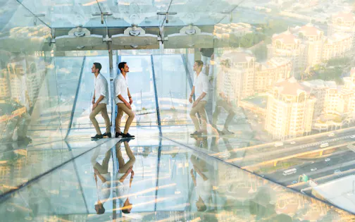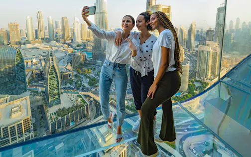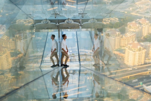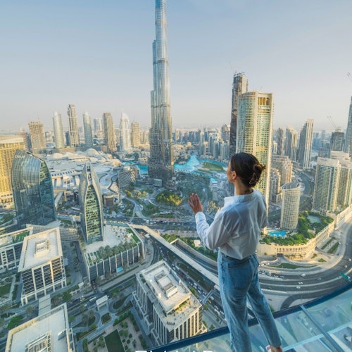 More than 200 meters above Dubai, the Sky View Observatory features an astonishing 25 m long glass floor that gives you exceptional views of the Burj Khalifa and the city below!