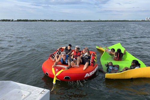 Set sail and bask in the glory of the radiant Biscayne Bay aboard a sleek catamaran. The day is yours to relish, with an array of snacks and a selection of alcoholic and non-alcoholic beverages to tickle your taste buds as you soak up the glorious sun. * Embark on a thrilling boat tour across the shimmering waters of the bay. Unleash the adventurer within, choosing from a medley of water activities or simply unwind on deck, lulled by the gentle waves. Feel the thrill as you zip across the bay on a jet ski, or glide gracefully on a tubing ride. * The party platform awaits, a buzz of excitement and fun. Here, water toys abound, music fills the air, and delicious drinks and snacks are at your fingertips. As the day winds down, the catamaran gently returns to dock, etching this unforgettable day into your memory. Book now to secure your spot on this exciting adventure!