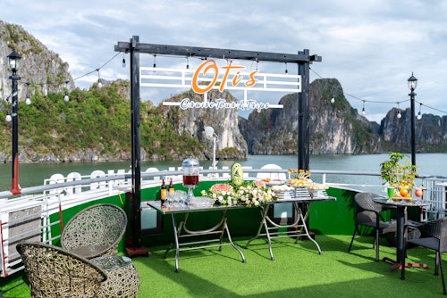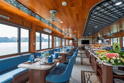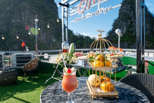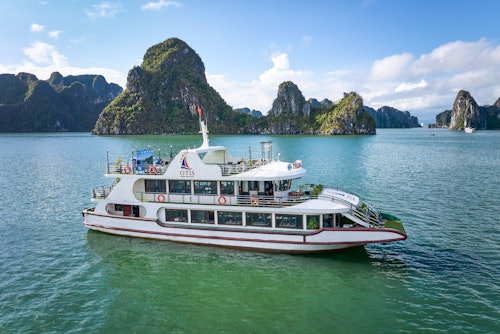 Sail through Ha Long Bay on a full-day cruise, a UNESCO World Heritage Site. * Pass limestone karsts, visit Sung Sot Cave, kayak or board a bamboo boat (not included in this ticket) at Luon Cave, and hike Ti Top Island for views of the bay. * Eat a seafood lunch on board, relax on the sundeck, swim at the beach, and close the day with a sunset gathering that includes wine, cakes, and fruits.