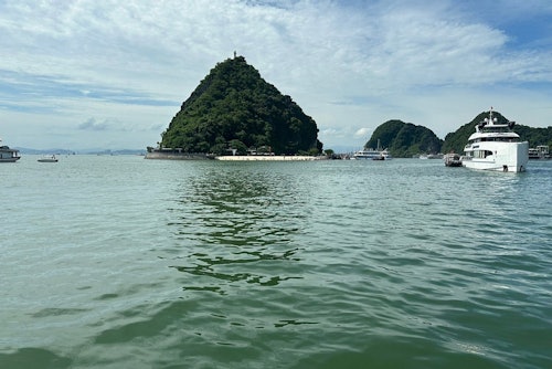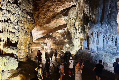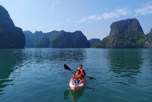 Start your tour with a hotel pickup and head to Halong Bay. * Arrive at Ha Long port, board the cruise, and begin exploring the bay. The cruise will pass by various islands, including Hon Ga Choi, a symbol of Halong Bay. Enjoy a delicious lunch served onboard. * Visit Sung Sot Cave, one of Halong Bay's popular caves. Choose to kayak or take a bamboo boat to Luon Cave (additional cost applies). After kayaking, board the cruise to visit Ti Top Island. Swim at Ti Top Beach or hike to the top of Ti Top Mountain for a panoramic view of Halong Bay. * Return to the cruise, which will head back to the port. Relax on the deck, listen to music, and take in scenic views of the surroundings.