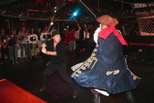 ¡Prepárate para divertirte durante una aventura de piratas en el Caribe! Sube a bordo del auténtico barco pirata Jolly Roger para reír mientras surcas alta mar en un divertido crucero por la bahía de Cancún. * ¡Juega a todo tipo de juegos de temática pirata, concursos y bailes con patas de palo, y ve espectaculares escaramuzas con cañones, espadas y unos cuentos parches! * ¡Al abordaje!
