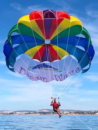 ¿Estás buscando una actividad divertida en Albufeira? Pues prueba esta experiencia de paravelismo del más alto nivel en el Algarve, planea sobre las olas y siente la brisa del mar en una emocionante aventura aérea que, sin duda, será el punto culminante del día. * Y tómatelo con calma, ¡ya que tienes dos horas y media para disfrutar del paisaje de la costa, broncearte y esquivar a las gaviotas!