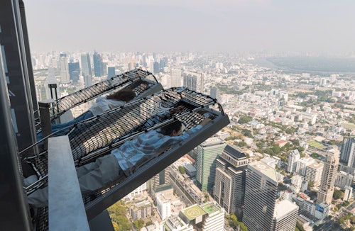Recorre de puntillas la cima de los rascacielos de Bangkok y experimenta la emoción que provoca el vértigo desde la plataforma de observación Mahanakhon SkyWalk. Esta entrada te llevará a la azotea del mirador más alto de la capital tailandesa en tan solo 50 segundos. * Con una vista panorámica de 360° de toda la ciudad y 314 metros de vertiginosa altura, no importa si eliges un atardecer espectacular, un brillante crepúsculo o una mañana pálida: las vistas te dejarán sin palabras.