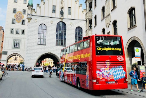 Montez à bord d'un bus à impériale rouge vif et découvrez les merveilles touristiques de Munich ! Avec 16 arrêts pratiques le long de l'itinéraire, les passagers ont la liberté de monter et descendre toutes les 15 à 30 minutes, explorant les points forts de la ville à leur propre rythme. Lorsque le bus passe devant la majestueuse Königsplatz, admirez son architecture classique avant de contempler l'impressionnant obélisque du roi Louis Ier sur la Karolinenplatz. Cinq minutes après le début du voyage, l'arrêt Odeonsplatz (H2) vous attend. Descendez ici pour immortaliser l'étonnant temple de Diane qui se dessine à travers le Hofgarten, ou aventurez-vous dans la Residenz, un complexe muséal abritant un ancien palais ducal. Passez devant le charmant parc de sculptures publiques Finanzgarten, l'enchanteresse fontaine du palais du Prince Carl et la captivante Maison de l'art. Le voyage se poursuit ensuite jusqu'à Isartor, où les passagers peuvent se rendre directement sur la très animée Marienplatz (H3).