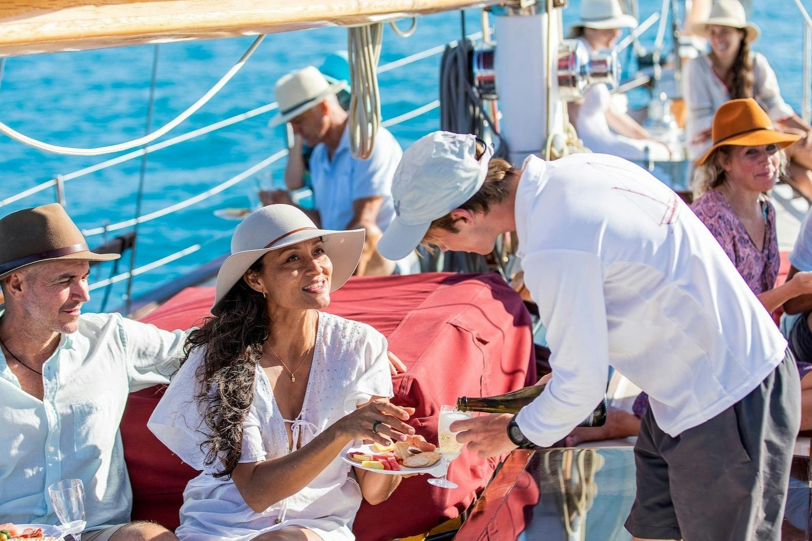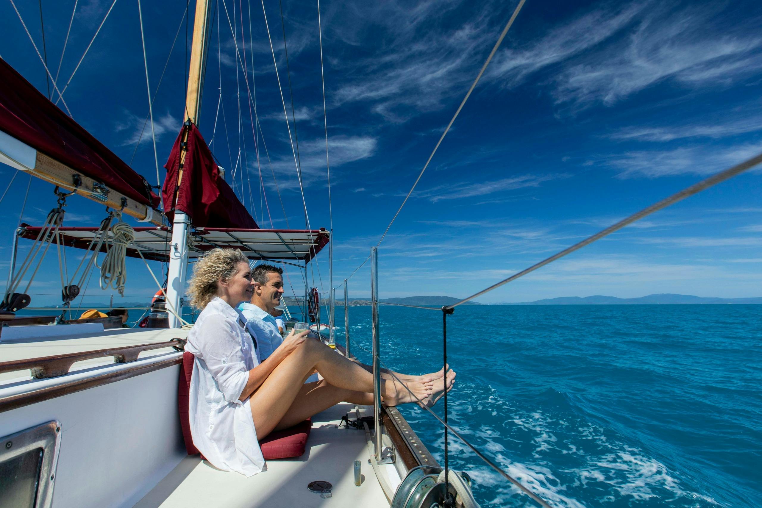 Commencez votre journée par un transfert de courtoisie d'Airlie Beach à Coral Sea Marina. Embarquez à bord du Lady Enid, un élégant yacht, pour une excursion à la voile réservée aux adultes dans les Whitsundays. Commencez par le thé du matin, qui comprend du café frais, des thés et des friandises. Faites de la plongée avec masque et tuba le long des récifs où la vie marine est intense, puis revenez pour un déjeuner gastronomique préparé à partir d'ingrédients locaux. Visitez Tongue Bay et faites une courte promenade jusqu'au point de vue de Hill Inlet. Descendez à Betty's Beach à Whitehaven pour vous baigner ou vous détendre sur le sable siliceux. Pendant que le yacht revient, dégustez un vin mousseux australien et un plateau d'antipasto.