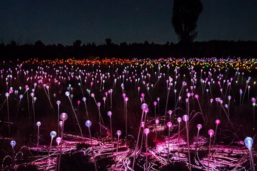 Visitez l'exposition Field of Light à Uluru. Créée par l'artiste Bruce Munro, cette exposition présente 50 000 fuseaux de lumière répartis sur une surface équivalente à sept terrains de football. Les lumières couvrent le désert de nuances d'ocre, de violet profond, de bleu et de blanc. L'exposition, baptisée Tili Wiru Tjuta Nyakutjaku dans la langue locale Pitjantjatjara, restera ouverte indéfiniment en raison de la demande populaire. Il s'agit de la plus grande œuvre de Munro à ce jour, qui offre une expérience visuelle de grande envergure dans le désert.