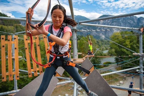 C'est bien plus qu'un simple parcours de cordes. Entrez dans le parc d'aventures aériennes Rope Runner et profitez d'un parcours d'obstacles à 18 mètres du sol. Pas besoin d'être un pro de l'escalade ! * Prêt à relever le défi ? Sautez entre 50 éléments passionnants, comme des filets, des ponts suspendus et des tyroliennes, et affrontez vos peurs avec un saut en chute libre ! Le tout entouré des montagnes et des forêts verdoyantes de Colombie-Britannique, idéal pour respirer profondément...