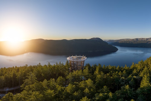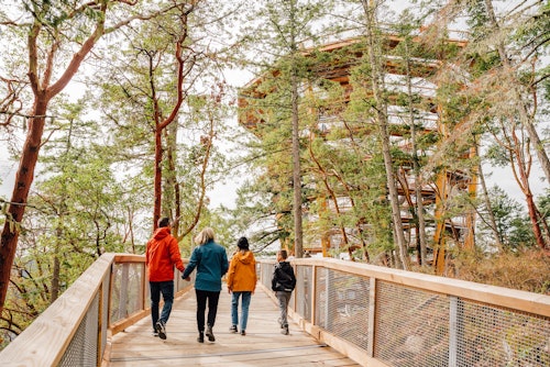 Admirez certains des plus beaux panoramas de l'île de Vancouver au Malahat SkyWalk, à quelques minutes de route du centre-ville de Victoria. Situé au sommet d'une montagne luxuriante surplombant la mer des Salish, il offre un accès inégalé à la beauté de la nature. Auparavant, ce type d'aventure était réservé aux explorateurs les plus agiles. Aujourd'hui, grâce au Malahat TreeWalk et à la Spiral Tower, tout le monde peut en profiter, y compris les personnes en poussette ou en fauteuil roulant. Montez la rampe en spirale pour atteindre de nouveaux sommets d'aventure. À 250 mètres au-dessus du niveau de la mer, la tour offre une vue incroyable sur l'île de Vancouver, notamment sur le mont Baker, le bras Finlayson, la péninsule de Saanich et les îles voisines. Explorez la côte ouest d'une toute nouvelle perspective et, lorsque vous serez prêt à redescendre, choisissez entre une marche tranquille le long de la rampe ou une descente excitante sur le toboggan en spirale.