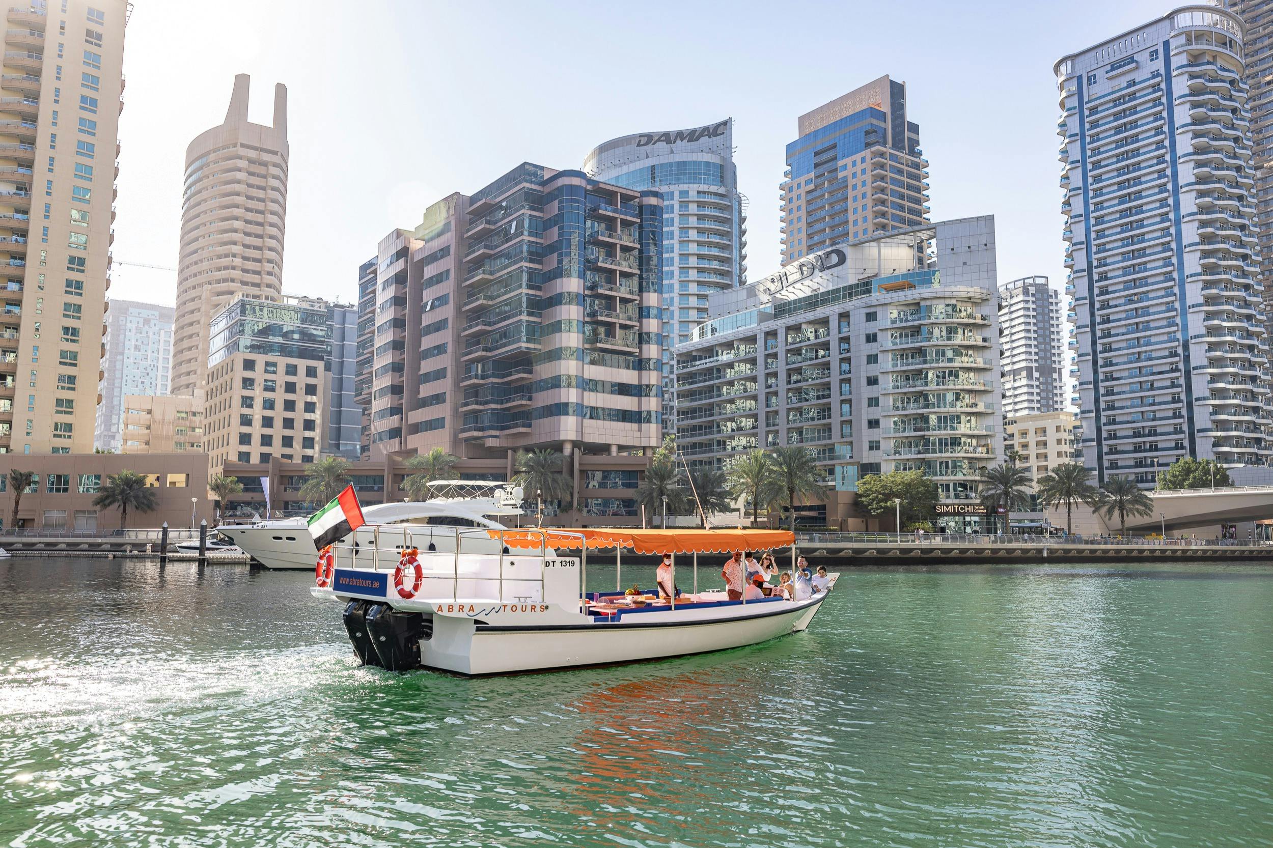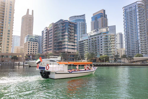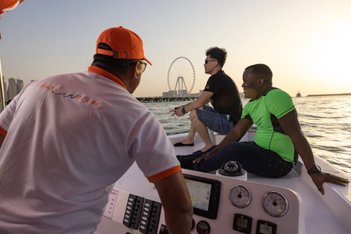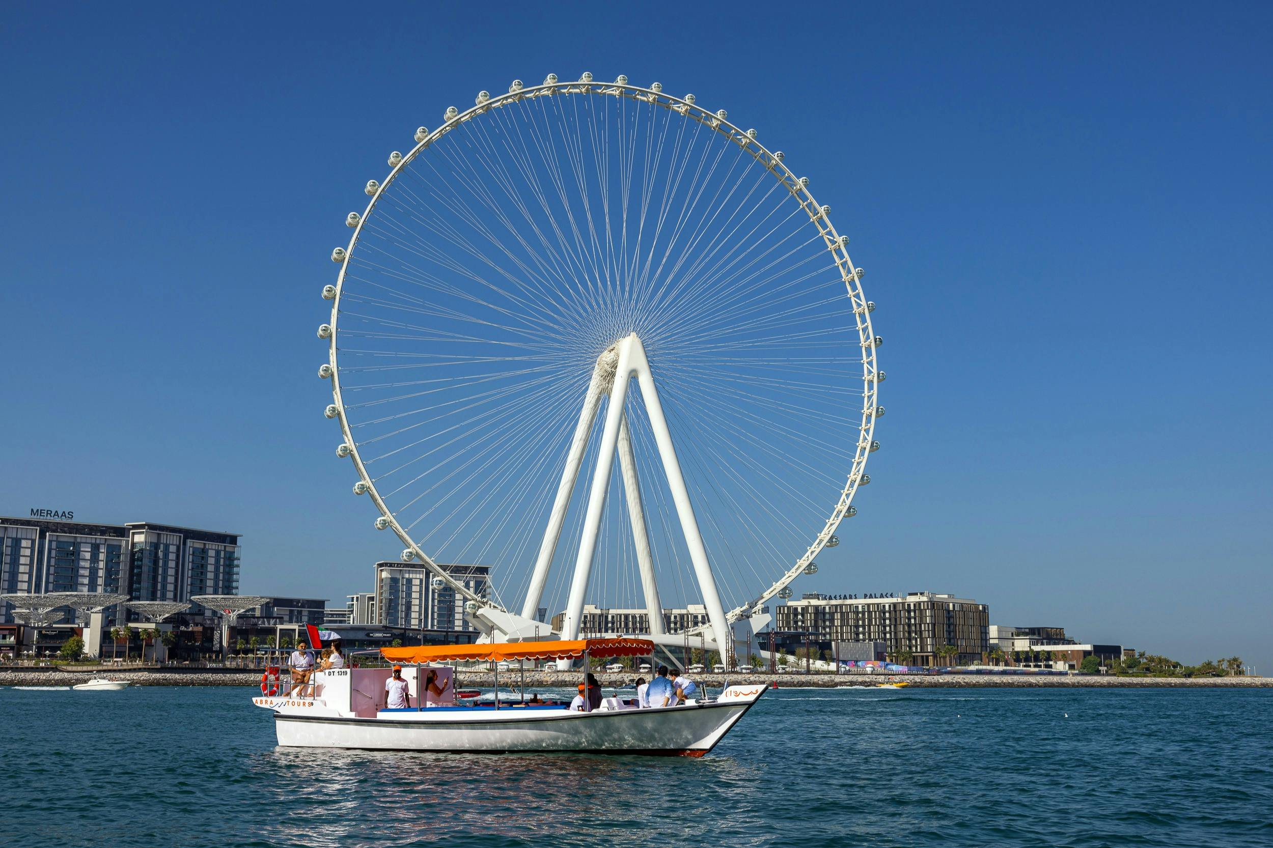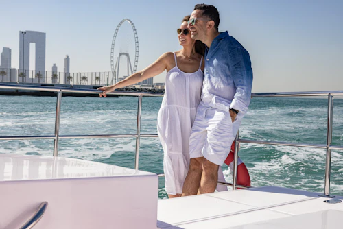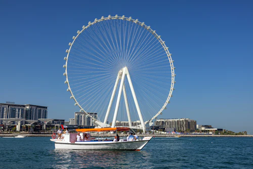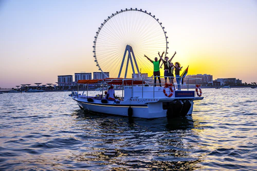 En l'espace d'une heure et demie, vous pouvez vous imprégner de l'ambiance de Dubaï grâce à des billets pour une croisière autour de la Marina de Dubaï, de l'imposant Ain Dubai et de l'île artificielle de Bluewaters. Admirez la ligne d'horizon étincelante de Dubaï comme un mirage du désert depuis l'eau pendant que vous passez devant les sites emblématiques de cette ville chic : Burj Khalifa, JBR, Ceasars Palace, pour n'en citer que quelques-uns. Venez jouer avec les riches et célèbres dans et autour de la marina de Dubaï, où les yachts de luxe ne manquent pas à Dubaï, le Las Vegas du Moyen-Orient.
