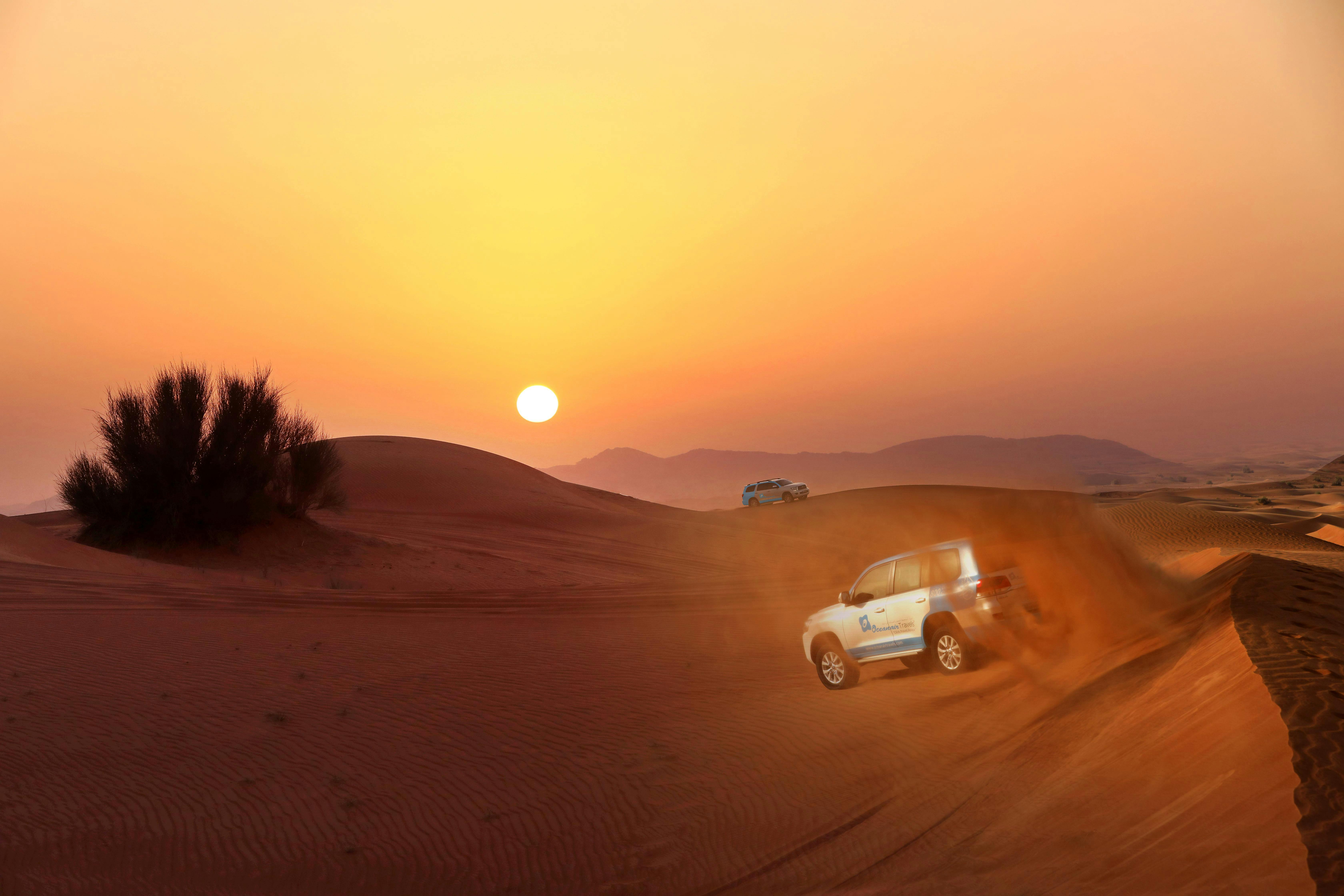 Laissez le paysage urbain moderne de Dubaï derrière vous et profitez d'une aventure dans le désert à l'oasis d'Al Marmoom. Vous serez pris en charge à votre hôtel à Dubaï et conduit dans le désert en 4x4 tout en apprenant les origines de Dubaï. Commencez votre safari dans le désert par une séance de dune bashing et de sandboarding, avant de rencontrer la troupe de chameaux que vous conduirez vers un village bédouin. Vous pourrez ensuite vous amuser dans le désert en vous baladant pendant 20 à 30 minutes à bord d'une Mercedes G-Class des années 1980. À votre arrivée au village, vous serez accueillis avec du qahwa (café arabe), des gaymat (boulettes sucrées) et des dattes. Vous êtes également invités à consommer des boissons non alcoolisées à volonté.