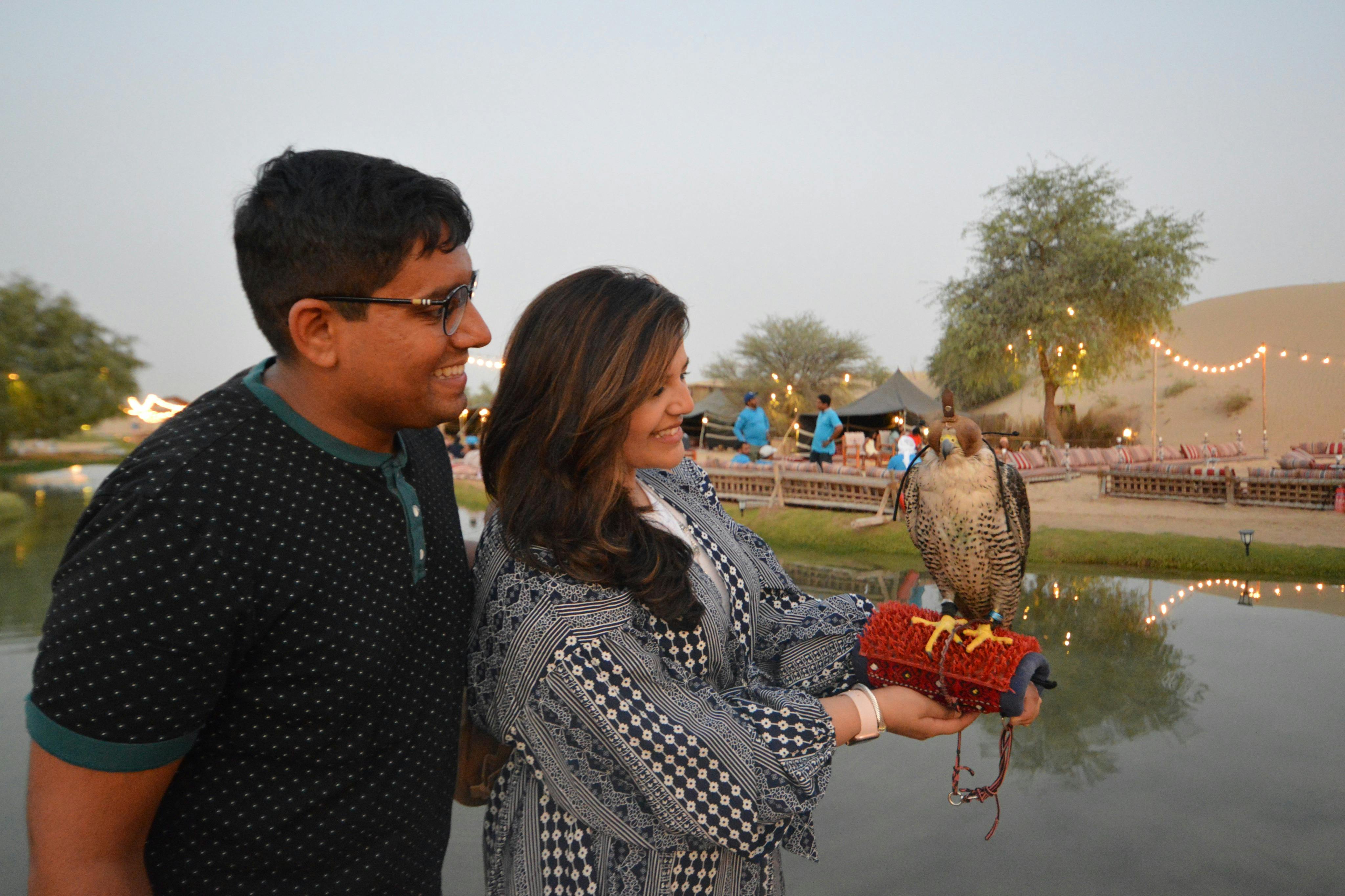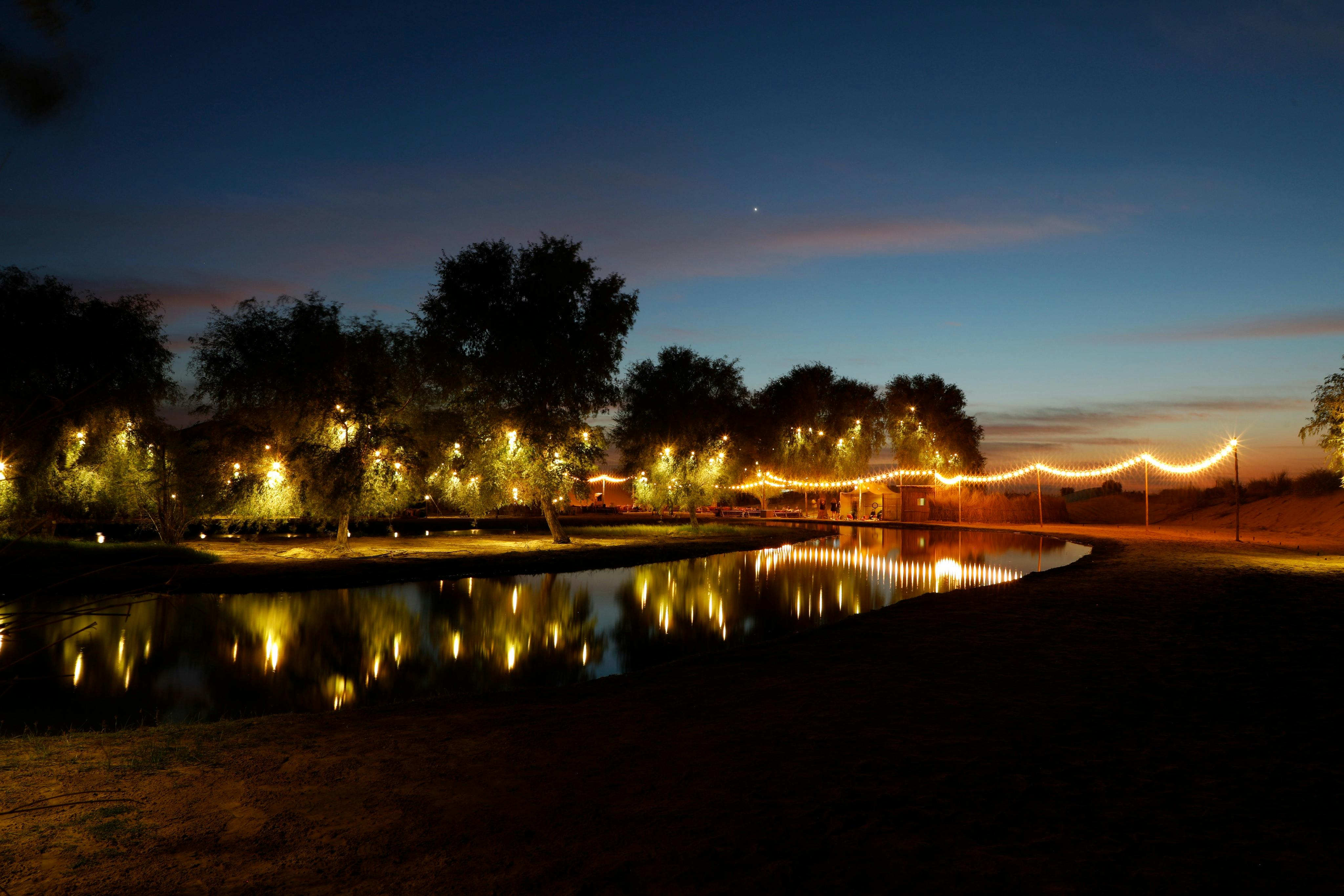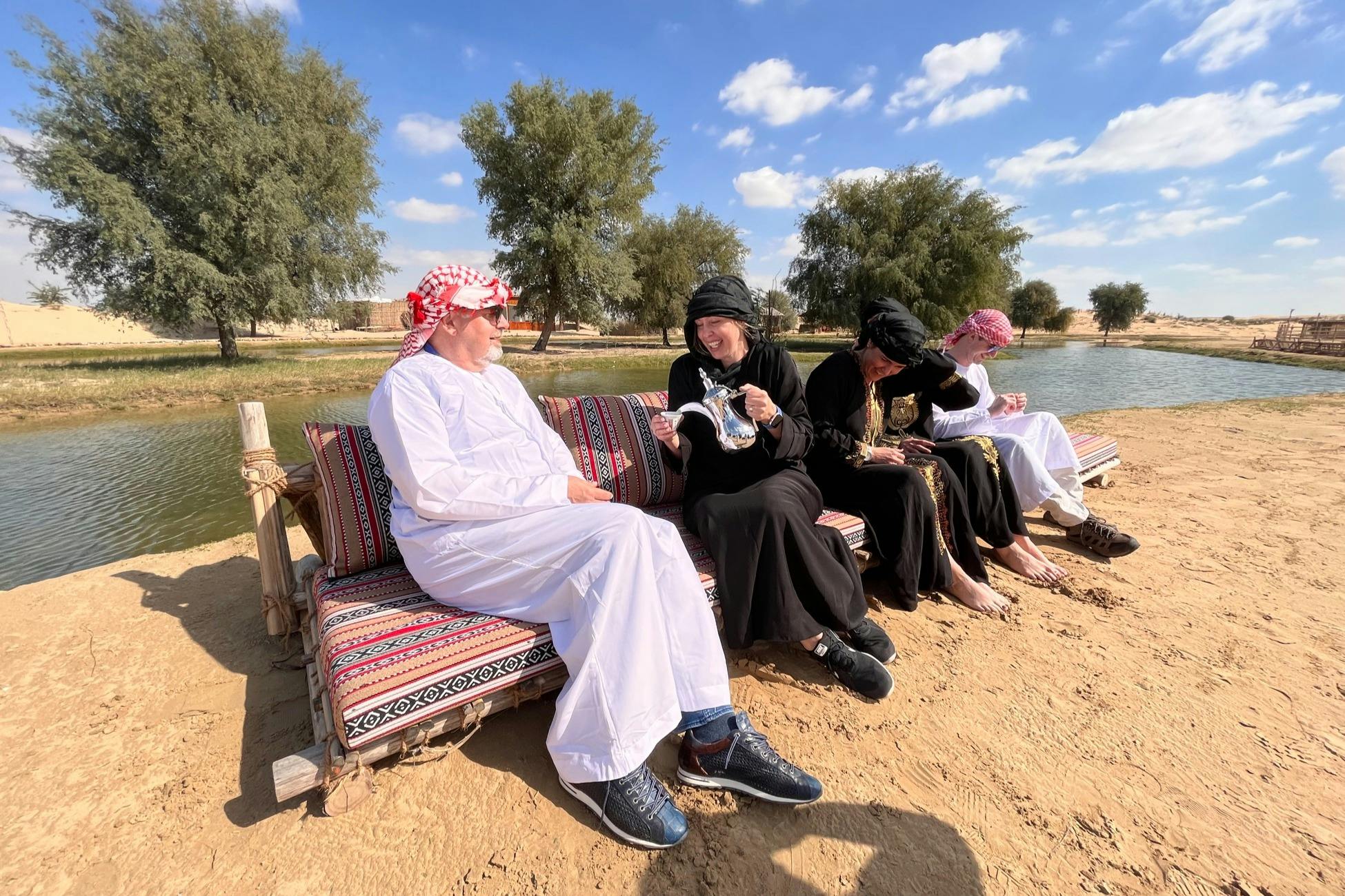 Au village bédouin traditionnel, vous serez accueilli à la manière locale avec un Qahwa (café arabe) fumant, des Luqaimat (sucreries) et des dattes avant d'embarquer pour une exaltante promenade à dos de chameau. Vous pourrez même prendre quelques selfies avec les chameaux ! Assistez à un superbe coucher de soleil au sommet des dunes, avec en toile de fond la magnifique oasis d'Al Marmoom et ses lacs. Ensuite, de retour au village, laissez-vous tenter par une métamorphose arabe, faites un peu de peinture au henné, prenez une photo avec un faucon et découvrez la vie animée du village caché dans l'oasis. Pendant que vous vous détendez dans la cabane ou la tente de votre choix, écoutez de la musique ethnique et découvrez l'ambiance émiratie avant un authentique dîner bédouin, suivi de desserts locaux. Enfin, profitez d'un authentique divertissement bédouin et regardez les étoiles briller dans le ciel du désert.