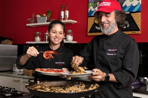 Commencez votre aventure culinaire par un verre rafraîchissant de cava catalan et un accueil chaleureux de la part des maîtres cuisiniers. Participez à un cours de cuisine pratique pour créer un repas de cinq plats comprenant des tapas et de la paella, en utilisant des ingrédients frais du marché de La Boqueria. Les restrictions alimentaires sont prises en compte. Savourez une "pica-pica" catalane avec du fromage Manchego, du Fuet (viande séchée catalane) et des olives espagnoles. Complétez votre repas avec une quantité illimitée de vins espagnols de Rioja et de Ribeira Sacra, sélectionnés dans les vignobles privés de la famille.