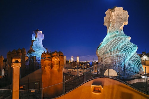 Entrez dans la Casa Milà, également connue sous le nom de "La Pedrera", à la tombée de la nuit et regardez-la prendre vie grâce à un incroyable spectacle audiovisuel sur le toit ! Découvrez ce bâtiment singulier et spectaculaire d'Antoni Gaudí, l'architecte catalan visionnaire.