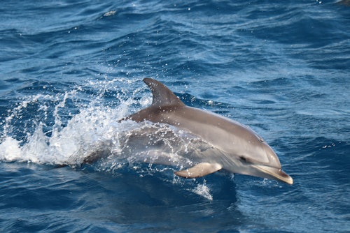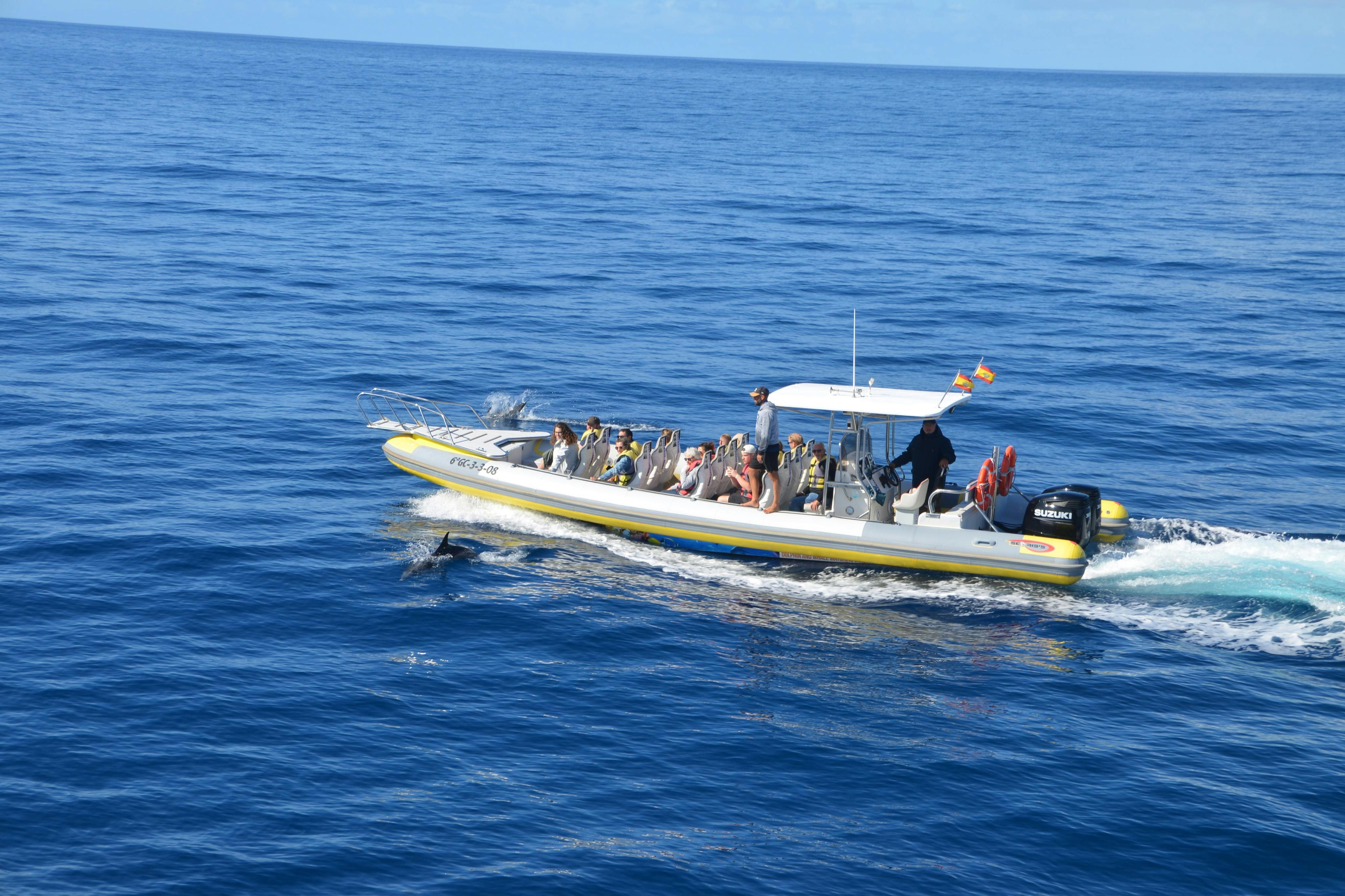 Plongez dans les merveilles aquatiques de la côte de Fuerteventura avec une escapade passionnante d'observation des dauphins et des baleines, au départ du port enchanteur de Morro Jable. Commencez votre voyage à l'un des points de rendez-vous sélectionnés, puis montez dans un confortable van climatisé pour un trajet ensoleillé jusqu'à la rampe de lancement du port de Morro Jable. Là, vous embarquerez à bord d'un hors-bord aux lignes pures, le navire idéal pour votre aventure en mer. Le hors-bord longe la côte en direction de la séduisante péninsule de Jandia, votre plateforme d'observation de la grandeur de la vie marine dans son habitat intact. Tandis que vous glissez sur les vagues azur, admirez le panorama à couper le souffle : montagnes escarpées, eaux turquoise cristallines et plages dorées gorgées de soleil. Restez vigilants ! Les véritables vedettes du spectacle, les dauphins espiègles et les baleines majestueuses, se donnent en spectacle. Vous pourrez même apercevoir un poisson volant ou une tortue faire une apparition surprise. Lorsque le rideau tombe sur votre aventure nautique, retournez au port de Morro Jable, où un transfert de retour vous ramène à votre lieu de prise en charge initial. Ne manquez pas cette odyssée océanique inoubliable !