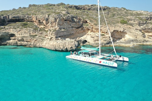 Depuis le port de Palma de Majorque, embarquez à bord du catamaran MAGIC pour une excursion en voilier à travers la baie de Palma jusqu'à Cala Vella. Arrêtez-vous au Cap Rocat, où vous disposerez de 45 minutes pour nager et faire de la plongée avec masque et tuba. Ensuite, direction Cala Vella, une belle crique aux eaux turquoise, où vous profiterez d'une heure et 45 minutes de loisir. Détendez-vous sur le tapis flottant, allongez-vous sur les filets de proue, nagez ou explorez les fonds sous-marins. Un repas sera servi sur la plage, suivi d'une autre baignade avant le retour au port de Palma.
