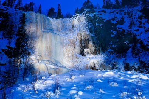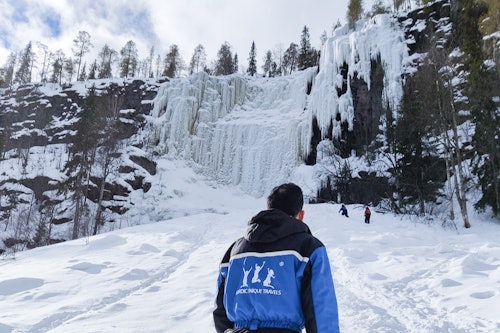 Promenez-vous dans un pays hivernal finlandais merveilleux lors de cette excursion de randonnée pour voir les chutes d'eau gelées de Korouoma, avec transport aller-retour depuis votre hôtel dans le centre de Rovaniemi. Avec la neige étincelante et les arbres givrés comme toile de fond, vous et votre guide expert ferez une randonnée (ou des raquettes) vers les chutes d'eau à couper le souffle situées dans le parc national de Korouoma. Faites une pause pour vous réchauffer près d'un feu de camp et dégustez un barbecue lapon accompagné d'un thé chaud aux myrtilles pour une aventure hivernale inoubliable.