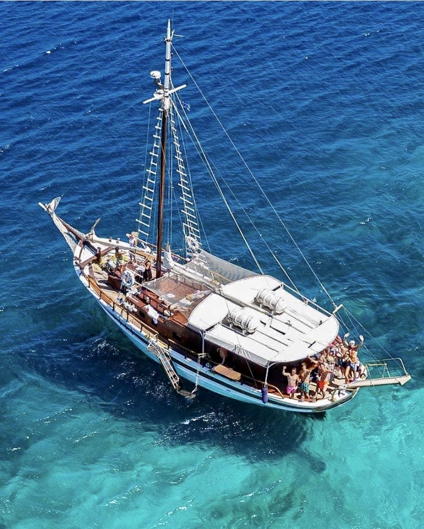 Mettez les voiles depuis le vieux port de Mykonos et naviguez vers le sud de l'île tout en profitant de la vue sur Kanalia et Agios Ioannis et les villas de luxe de ses habitants. Votre premier arrêt est l'île de Prasonisia pour une heure de snorkeling et de baignade ! * L'îlot vierge que vous visiterez ne fait pas partie des principaux itinéraires touristiques et est accessible à de rares personnes. Les fonds marins entourant Prasonisia regorgent de poissons, ce qui en fait l'endroit idéal pour faire du snorkeling. * Après la baignade et la plongée avec tuba, dégustez un meze grec et dégustez une bière ou une boisson sans alcool tout en naviguant sur la côte sud. Terminez la journée à Paradise Beach : vous aurez une heure pour explorer la plage, siroter des cocktails, vous essayer aux sports nautiques ou simplement nager et bronzer.