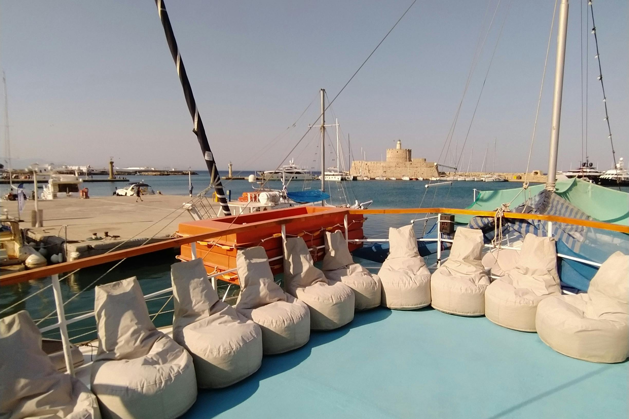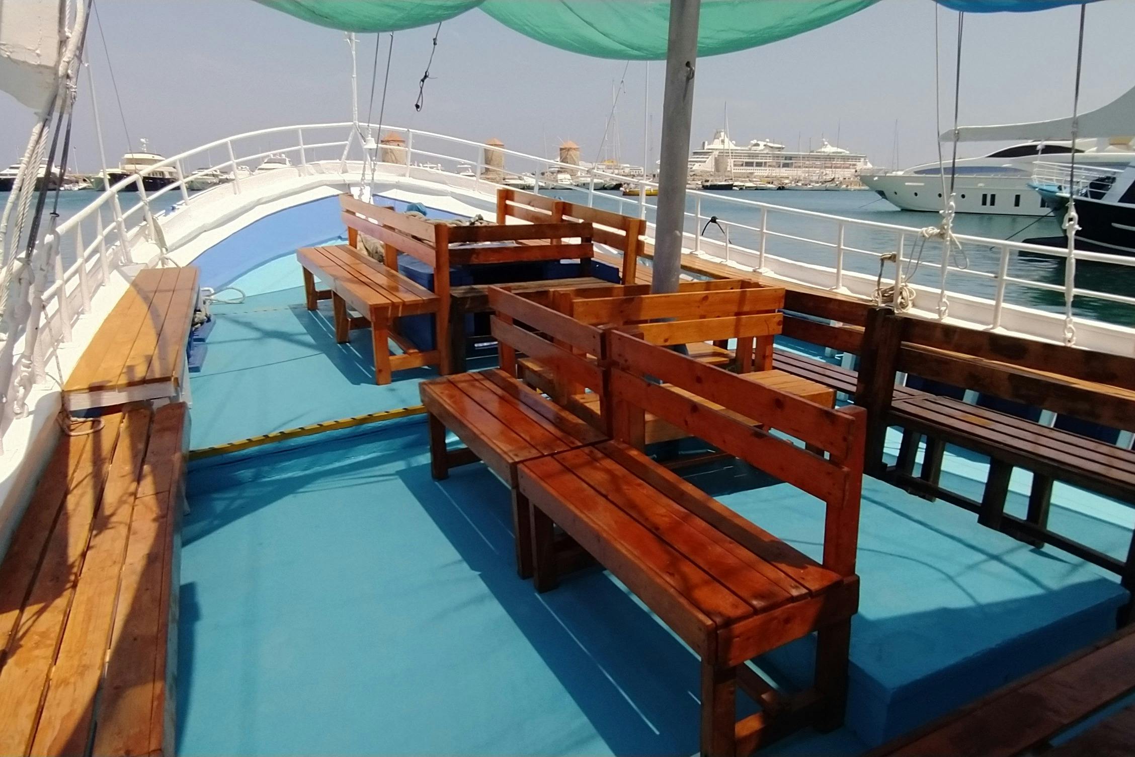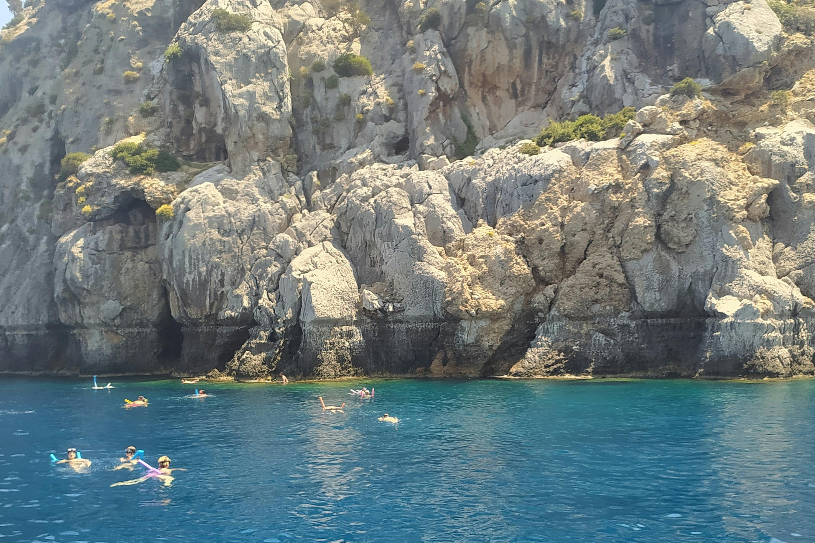 Départ du port de Mandraki et navigation le long de la côte est de Rhodes. Arrêtez-vous d'abord dans la baie d'Anthony Quinn pour 30 minutes de baignade. Continuez jusqu'à la plage de Tsampika pour une pause de 90 minutes. Au retour, arrêt à la baie d'Afandou pour 30 minutes. Le dernier arrêt est la baie de Kalithea pour 30 minutes supplémentaires et le retour au port de Mandraki en fin d'après-midi.