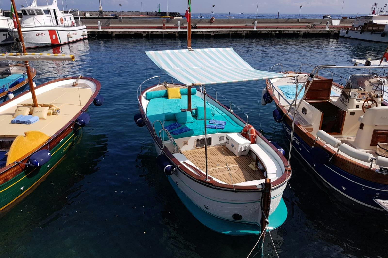 Faites un tour de Capri en bateau au coucher du soleil : vous aurez une vue calme des côtes et des grottes de l'île, en évitant les heures les plus chargées de la journée. Admirez les couleurs changeantes de la mer et de la côte à mesure que le soleil se couche. À bord, vous dégusterez une bouteille de prosecco, une dégustation de limoncello et une salade de fruits frais. Votre skipper expérimenté vous guidera tout au long du voyage et vous fera partager ses connaissances et anecdotes locales.