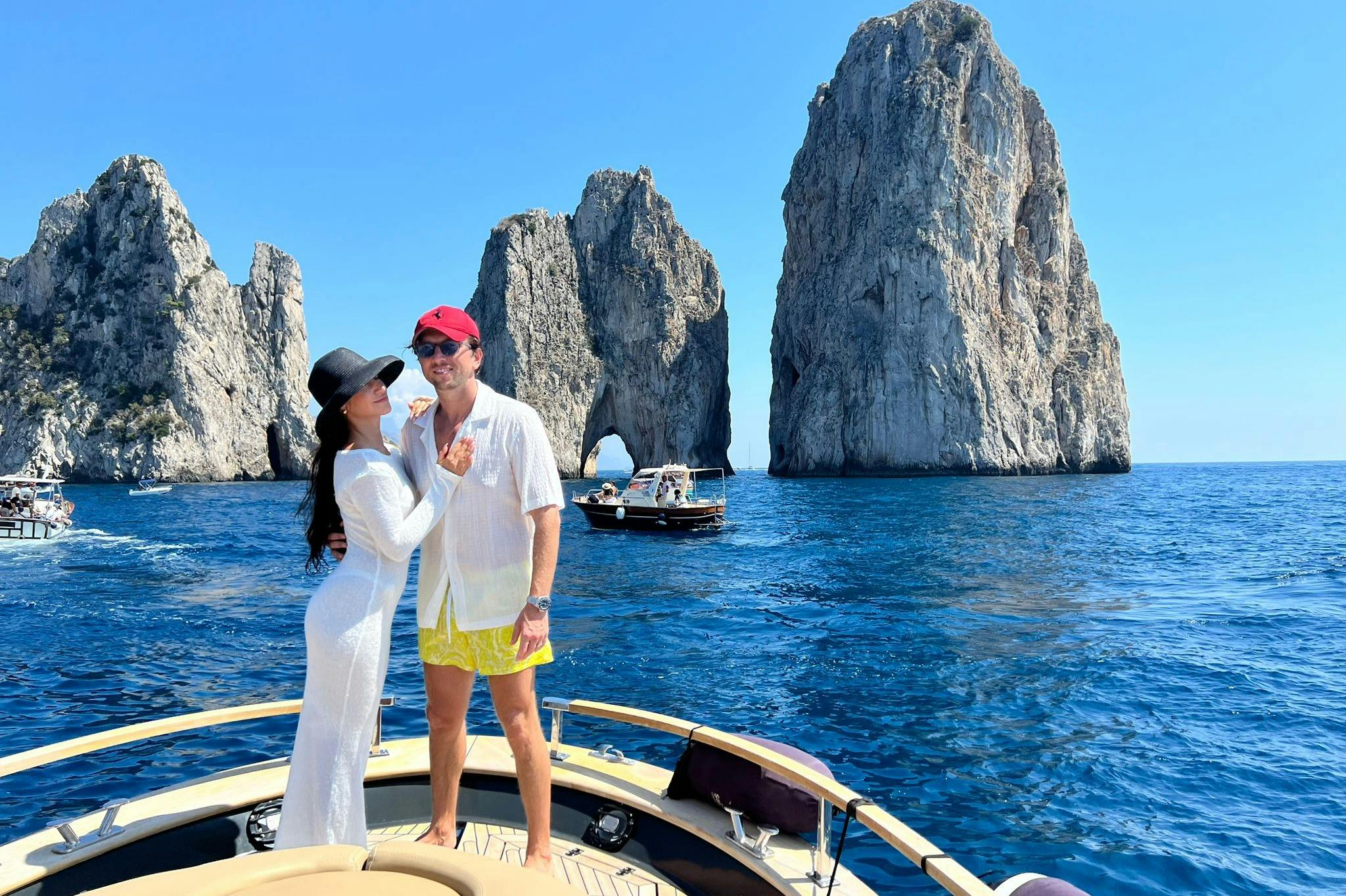 Commencez votre voyage au port de Sorrente et faites le tour de Capri en bateau. Vous visiterez à la fois des lieux connus et des endroits cachés. Nagez et faites de la plongée avec masque et tuba avec l'équipement fourni, et dégustez un repas de spécialités locales. Sirotez du prosecco et du limoncello faits maison tout en admirant la vue. Passez environ quatre heures à Capri, où vous pourrez faire du shopping, dîner ou visiter des sites historiques.