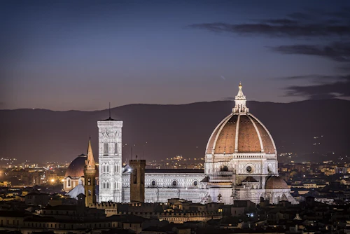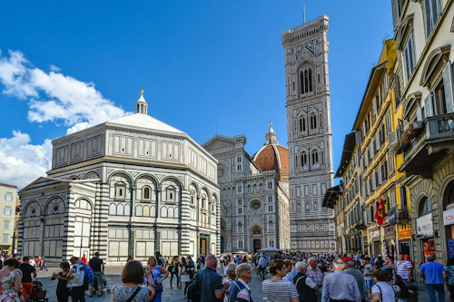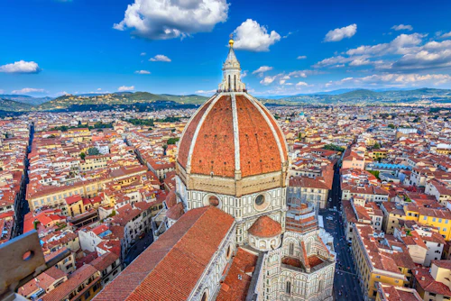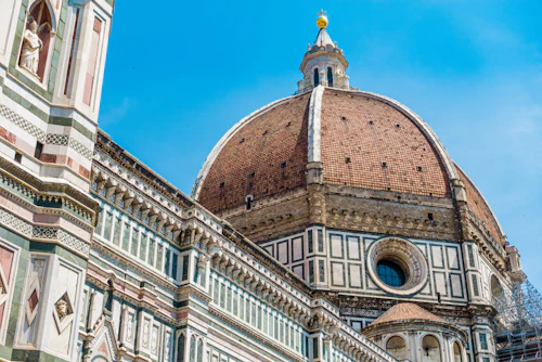 Participez à une visite guidée et visitez le Duomo de Florence, également connu sous le nom de cathédrale de Santa Maria del Fiore à Florence, un point de repère important et un joyau architectural de la Renaissance. Il est situé dans le centre de la ville, à proximité de la gare centrale. Connue pour sa coupole réalisée par Filippo Brunelleschi, elle compte parmi les églises les plus grandes et les plus visitées au monde. Sa construction a débuté en 1296 sous la supervision d'Arnolfo di Cambio et a bénéficié de la contribution de maîtres tels que Giotto et Francesco Talenti. Découvrez l'histoire, l'art et les détails de la cathédrale. Découvrez le complexe environnant, notamment le clocher de Giotto, le baptistère de San Giovanni et le Museo dell'Opera del Duomo.