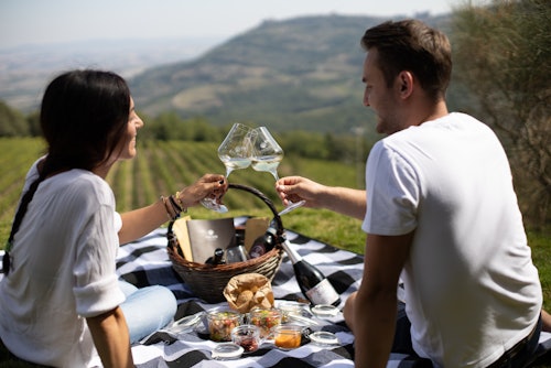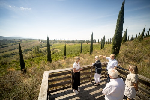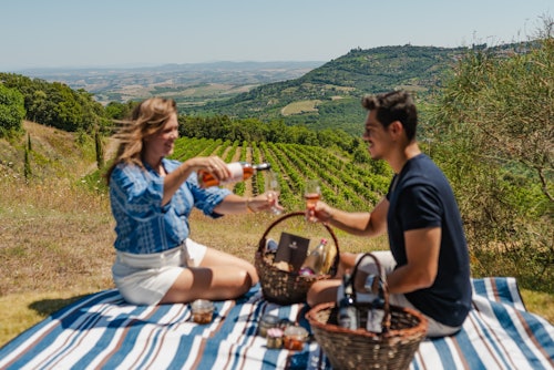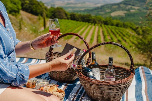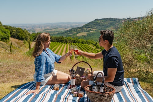 Profitez d'une visite des vignobles et de la cave (en option) pour découvrir de plus près la philosophie qui se cache derrière les coulisses. Apprenez les méthodes uniques de vinification et découvrez le sanctuaire de la cave, où certains vins sont conservés pendant des années. Après la visite, il est temps de se détendre en dégustant quelques vins, accompagnés de délices faits maison lors d'un pique-nique. Un emplacement dans le vignoble a déjà été réservé pour vous ! N'oubliez pas de ramener un peu de Montalcino chez vous en choisissant un vin à emporter !
