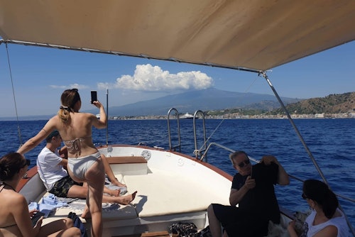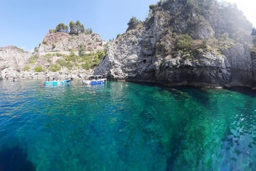 Rejoignez-nous pour une excursion en bord de mer le long de la côte de Taormine, afin de tout voir d'une autre perspective et de visiter des endroits inaccessibles depuis la terre ferme. Nous admirerons les belles baies (baie de Naxos, baie de Mazzarò, baie de la Sirène) et les grottes (grotte de l'Amour, grotte Bleue), nous verrons le rocher de la figue de Barbarie et le rocher de l'éléphant, accompagnés par les explications de notre capitaine. Nous nous arrêterons pour nous baigner dans les eaux cristallines de l'Isola Bella et pour un apéritif rafraîchissant avec du prosecco et des pâtes aux amandes typiquement siciliennes. L'excursion sera amusante et accessible à tous les participants, quel que soit leur âge.
