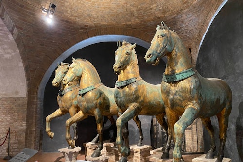 Lors d'une visite touristique à Venise, il est impossible de manquer l'incroyable basilique Saint-Marc, qui se dresse fièrement au milieu de l'agitation de la place Saint-Marc. Connue sous le nom de Basilique d'or, en raison de son éblouissant ensemble de mosaïques réalisées avec de l'or pur, elle est chargée d'histoire et de mystère, mais votre guide vous présentera une introduction remplie de faits fascinants ! Évitez les longues files d'attente et rejoignez votre expert local pour pénétrer dans la magnifique cathédrale à cinq dômes et admirer les innombrables chefs-d'œuvre et scènes bibliques qui ornent les murs. Accédez à la terrasse, où vous pourrez admirer un assortiment éclectique d'objets d'origines diverses et vous délecter d'une vue imprenable sur la ville. N'oubliez pas de télécharger l'audioguide pour une explication plus approfondie de tout ce que cache Saint-Marc. Si seulement les murs pouvaient parler !