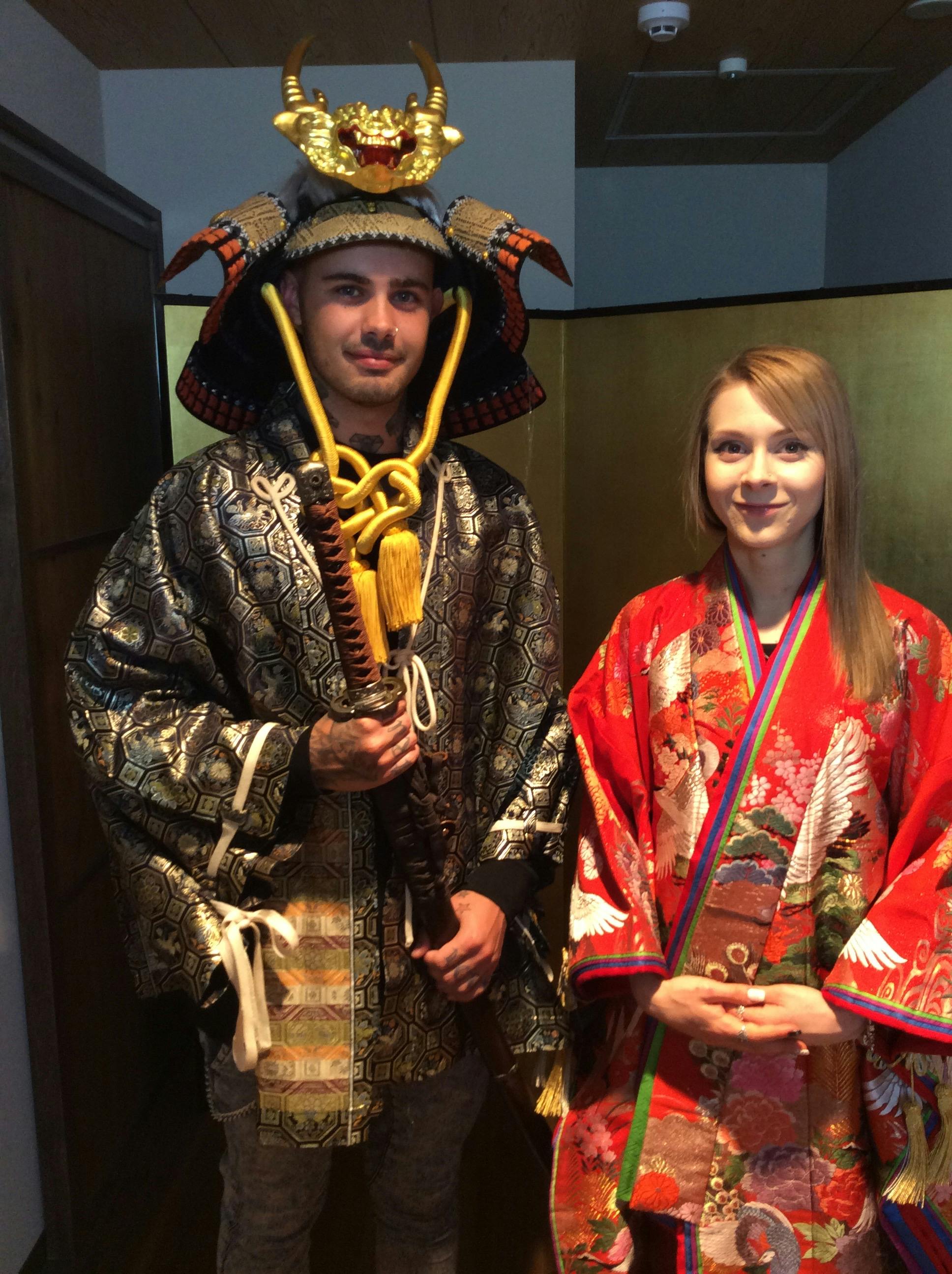Shooting photo avec une armure de samouraï traditionnelle pour les hommes et un kimono pour les femmes