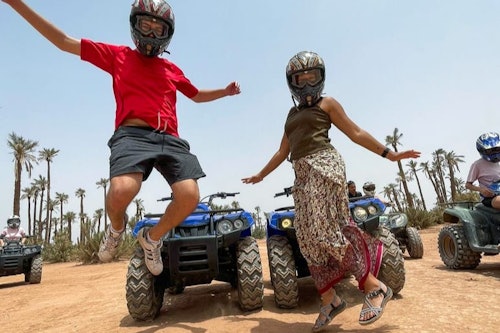 Conduisez un quad dans le désert de la Palmeraie. Profitez de la combinaison de vitesses excitantes et de l'apprentissage de la culture locale. Convient à ceux qui aiment le rythme rapide ou qui veulent une expérience plus culturelle.