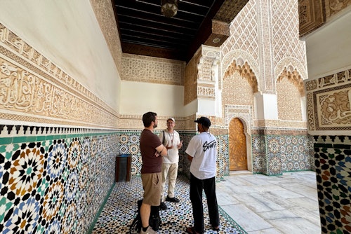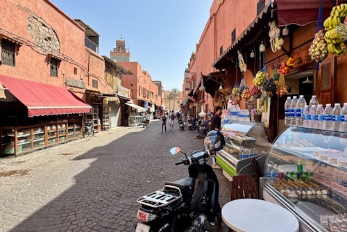Commencez par le palais de Bahia, une résidence du XIXe siècle avec des jardins, des tuiles et des plafonds en bois sculpté. Il a été agrandi par la suite pour accueillir le harem royal. Continuez vers le Mellah, l'ancien quartier juif avec ses rues étroites, ses boutiques d'épices et ses balcons traditionnels. Passez devant le palais royal, qui est toujours une résidence officielle, et devant Bab Agnaou, une porte du XIIe siècle. Visitez la mosquée Koutoubia, dont le minaret a inspiré la tour Giralda de Séville. Traversez Jemaa el Fna, une place animée par des conteurs, des vendeurs et des artisans. Terminez la visite par la madrasa Ben Youssef, datant du XVIe siècle, qui fut l'un des plus grands collèges islamiques.