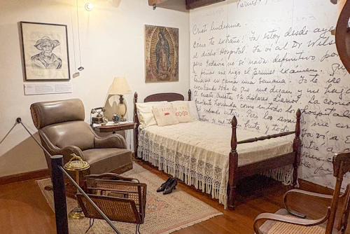 Visitez le Museo Frida Kahlo à Coyoacán, Mexico. Connu sous le nom de La Casa Azul en raison de ses murs bleu cobalt, ce musée est le lieu de naissance et la maison de l'artiste Frida Kahlo. Vous y verrez ses peintures, ses photographies et ses objets personnels, ainsi que de l'art populaire et des pièces préhispaniques. Promenez-vous dans son atelier, sa chambre et son jardin. Au Museo Casa Kahlo, découvrez la vie personnelle de Frida. Les expositions comprennent ses vêtements, ses journaux, ses instruments médicaux et des objets de la vie quotidienne. Comprenez sa personnalité vibrante et ses luttes personnelles. Ce musée allie de manière unique la vie et l'art de Frida.
