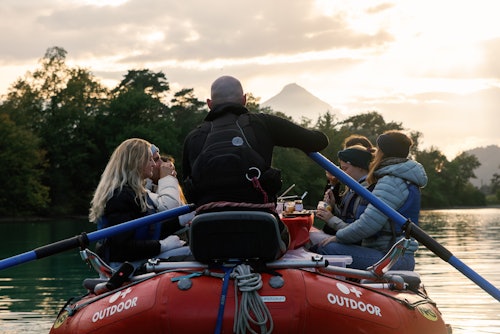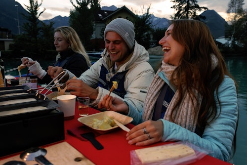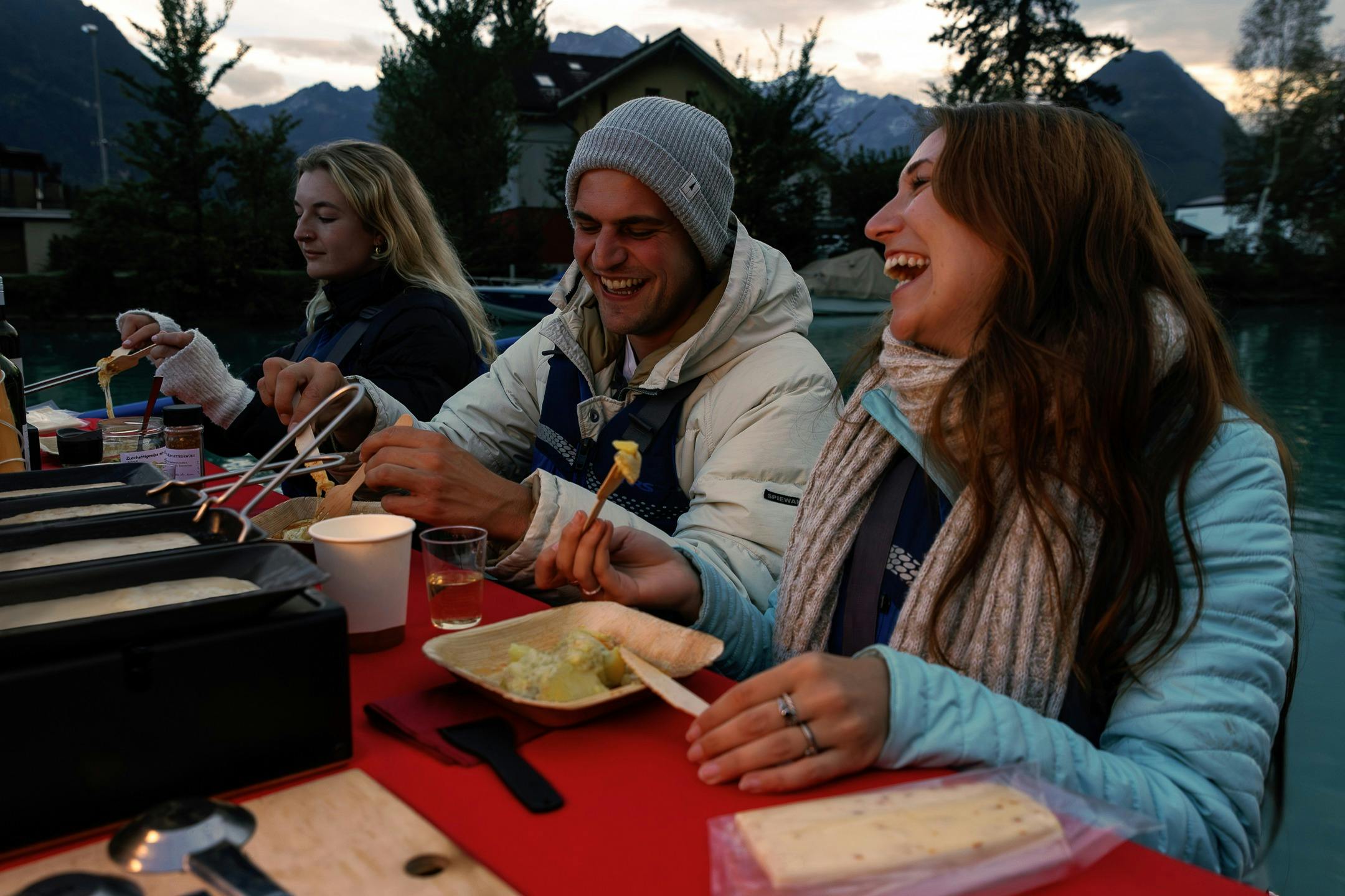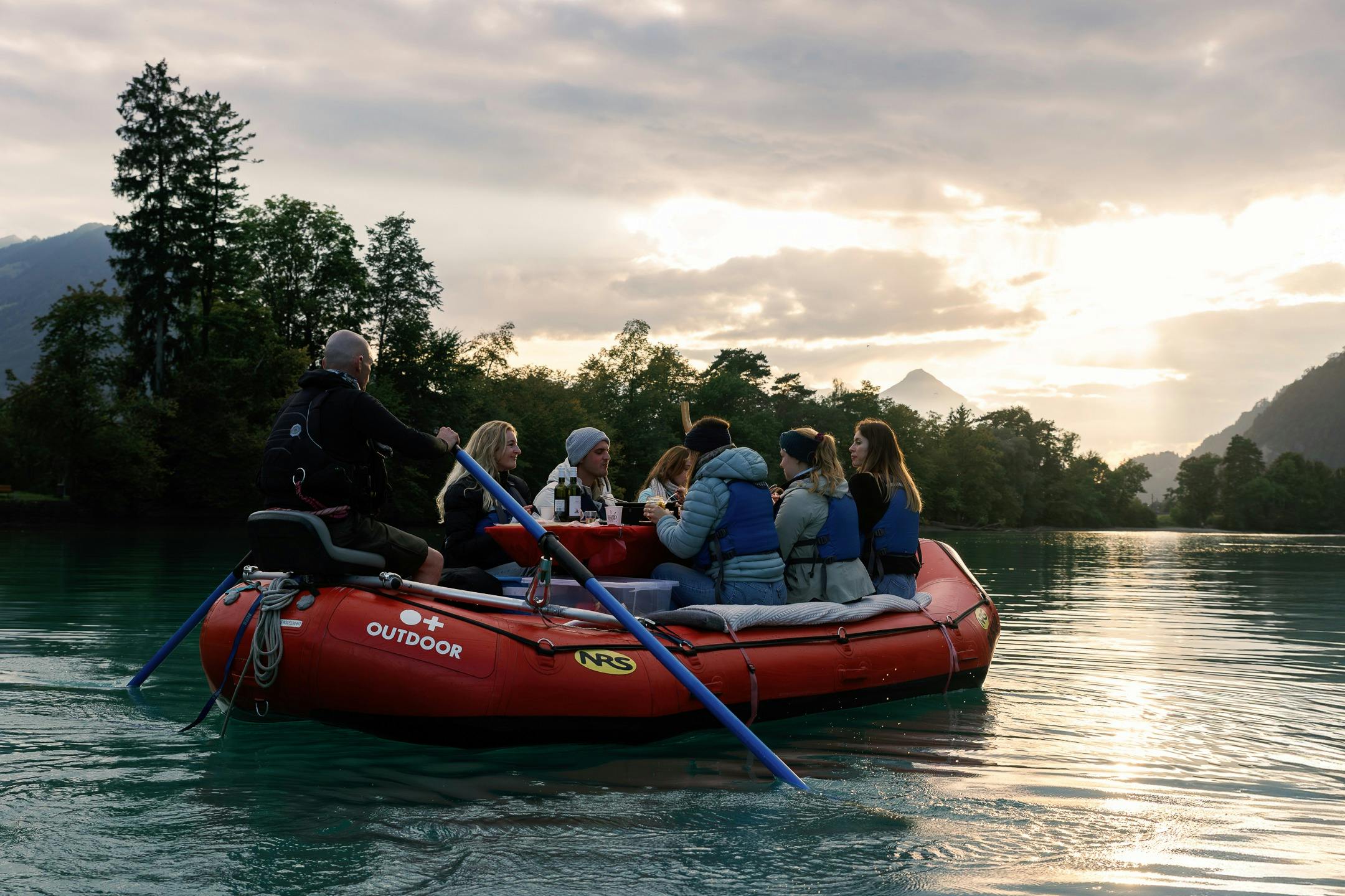 Retrouvez votre guide à l'endroit indiqué, enfilez un gilet de sauvetage et écoutez les consignes de sécurité. Montez à bord du radeau et découvrez le fromage à raclette. Pendant la promenade, du fromage à raclette, des pommes de terre et du vin seront servis. Une couverture polaire chaude est fournie si nécessaire. Flottez de Bönigen à Interlaken, en appréciant la nourriture, les boissons et le paysage. L'excursion se terminera près de votre point de départ.