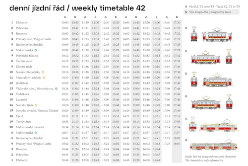 Remontez le temps en passant devant les sites les plus emblématiques de Prague à bord des tramways historiques de la ligne 42. Les tramways circulant sur cette ligne datent de l'époque de l'Empire austro-hongrois et jusqu'aux années 1960. Vous verrez certaines des plus belles attractions de la ville, notamment la rivière Vltava, le château de Prague, Náměstí Republiky, la porte Poudrière et la place Venceslas, tout au long de votre itinéraire. Profitez de la liberté de descendre dès qu'un site attire votre attention et explorez la ville au maximum. Trajet du tramway de la ligne 42 : Dlabačov - Pohořelec - Brusnice - Pražský hrad - Královský letohrádek - Malostranská - Právnická fakulta - Čechův most - Dlouhá třída - Náměstí Republiky - Masarykovo nádraží - Jindřišská - Václavské náměstí - Vodičkova - Lazarská - Národní třída - Národní divadlo - Újezd - Hellichova - Malostranské náměstí - Malostranská - Královský letohrádek - Pražský hrad - Brusnice - Pohořelec - Dlabačov