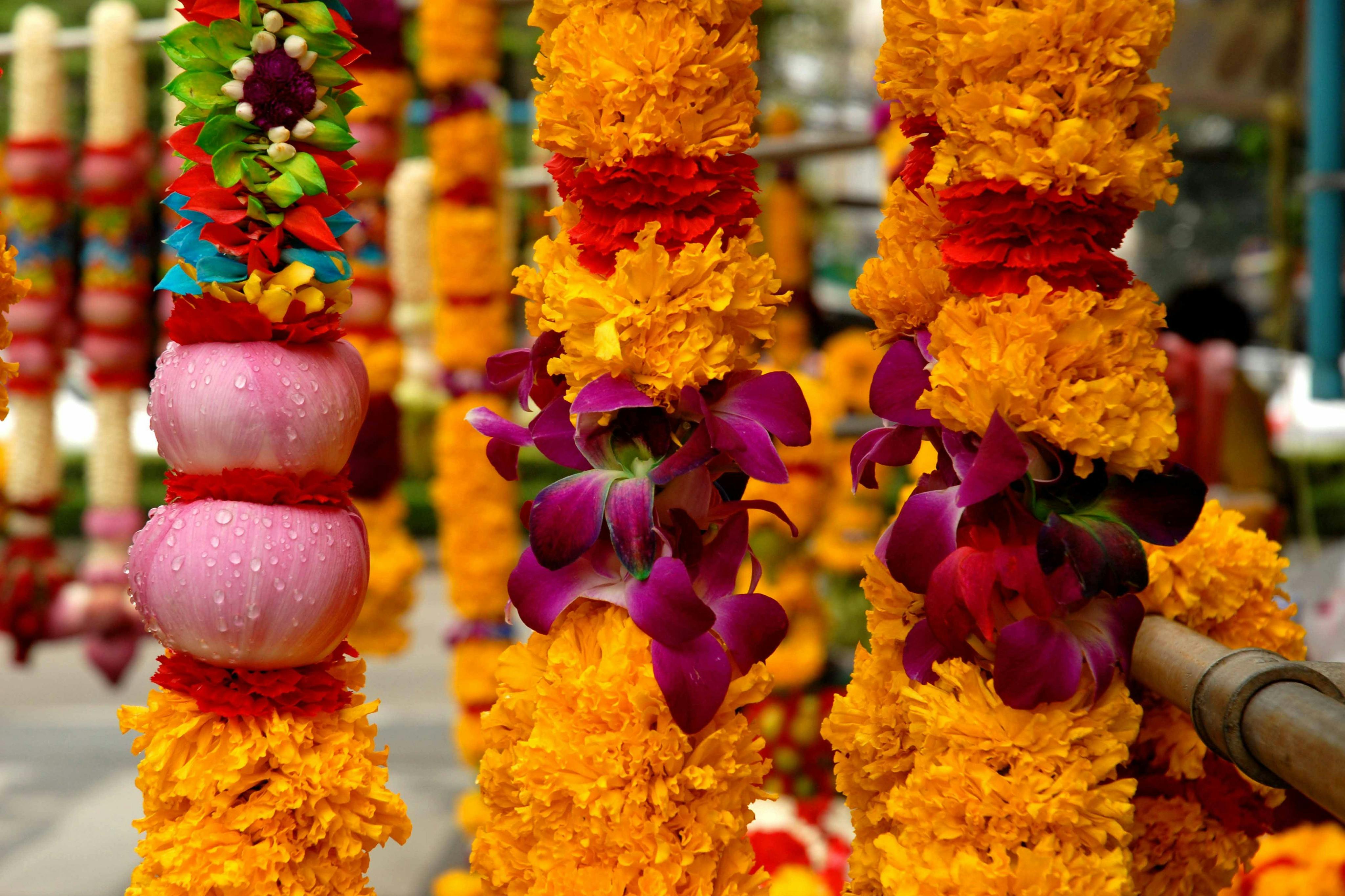 Commencez votre journée à Bangkok par une visite du temple de marbre, le Wat Benchamabophit. Laissez les guides vous montrer comment faire l'aumône aux moines. Explorez l'intérieur du temple et admirez sa collection de 52 statues de Bouddha. Ensuite, visitez Pak Klong Talat, le marché aux fleurs de Bangkok. Vous y verrez une grande variété d'orchidées et de jasmins. Découvrez leur rôle dans la culture thaïlandaise et observez les artisans créer des guirlandes de fleurs. Terminez votre matinée au Wat Arun, le temple de l'Aube. Admirez son architecture unique.