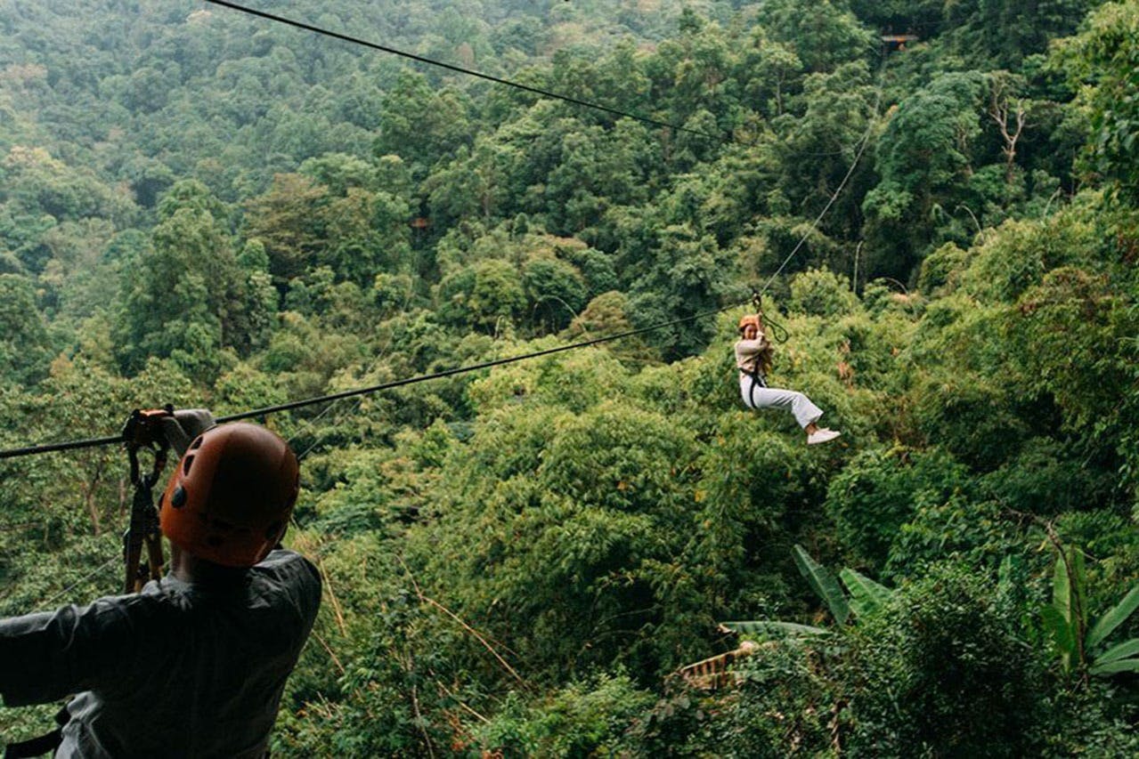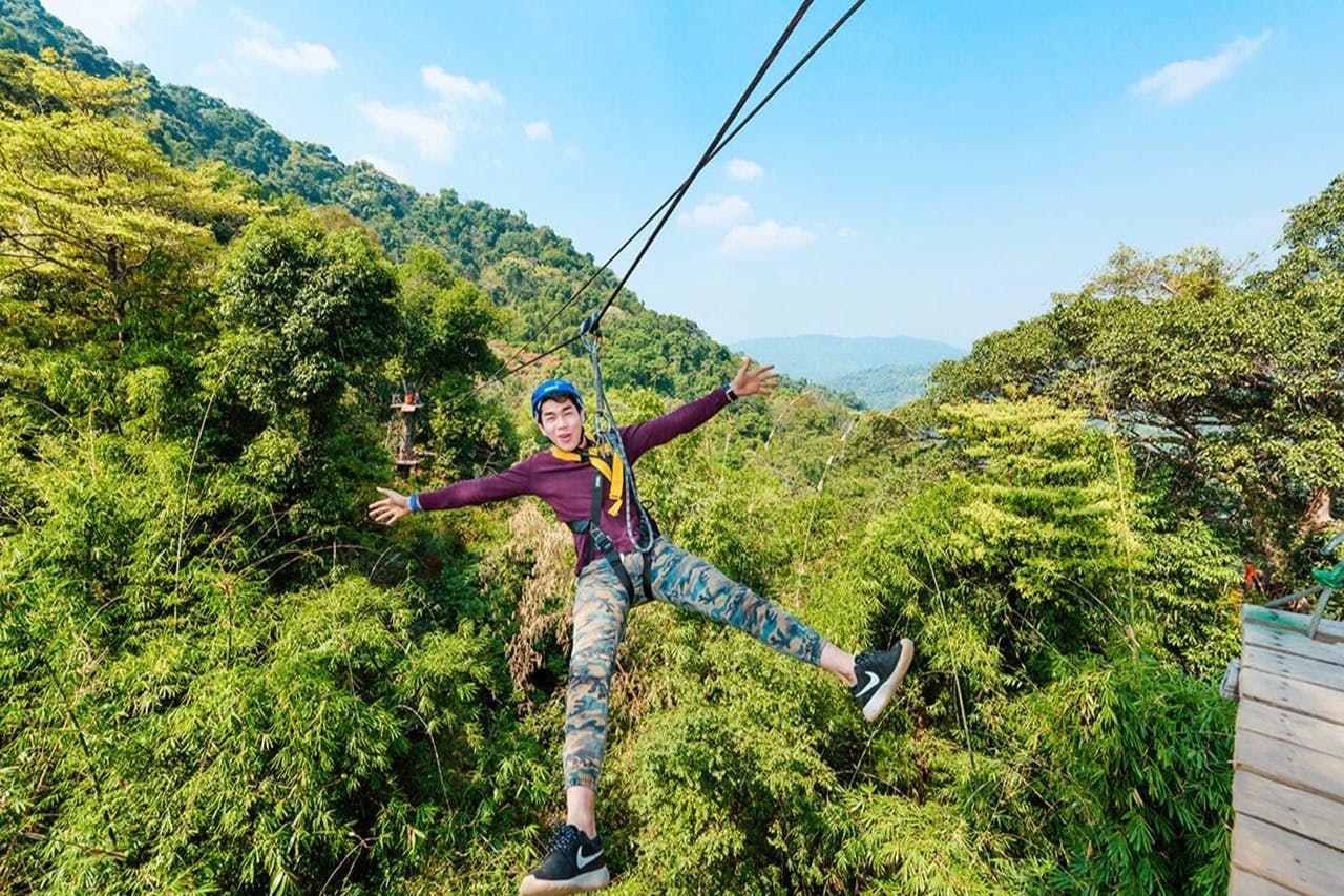 Participez à un voyage aérien à Chiang Mai. Commencez par une prise en charge à l'hôtel et un briefing complet sur la sécurité. Glissez au-dessus de la forêt tropicale sur l'une des plus longues tyroliennes de la ville, à 900 mètres. Profitez des activités avec 36 plateformes, 21 tyroliennes et une luge de la jungle de 2 100 mètres. Des ingénieurs experts ont conçu le parcours pour qu'il soit sûr et amusant, en utilisant des équipements de première qualité. Participez à des compétitions avec vos amis dans différentes zones d'activités. Chaque parcours contribue à la protection de la jungle du nord de la Thaïlande tout en minimisant l'impact sur l'environnement. Après la tyrolienne, un déjeuner buffet avec boissons et fruits de saison vous attend. Terminez par une courte promenade dans la nature avant de rentrer à l'hôtel.