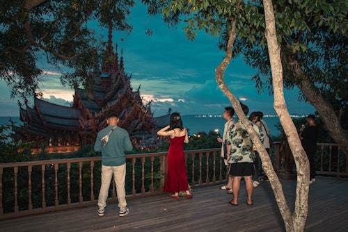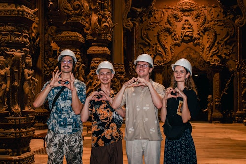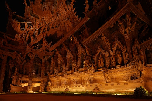 Explorez le merveilleux Sanctuaire de la Vérité, un hybride de temple et de château, sur le thème du royaume d'Ayutthaya et inspiré des croyances bouddhistes et hindoues. L'ingéniosité thaïlandaise est ici à l'honneur avec ses innombrables sculptures en bois. Découvrez la pertinence culturelle des différentes pièces sculptées et comment elles reflètent l'ancienne vision de la Terre, le savoir ancien et la philosophie orientale.