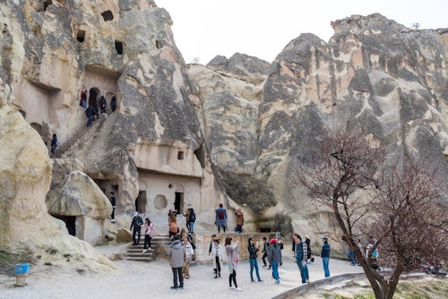 Le mystifiant musée en plein air de Göreme (musée national de Göreme), l'un des premiers sites du patrimoine mondial de l'UNESCO en Turquie, est un complexe de monastères situé au centre de la région de Cappadoce. Les habitations troglodytes en forme de nid d'abeille du musée sont gravées dans le paysage, offrant une intrigue visuelle et une histoire étonnante. Faites une visite guidée avec un sympathique guide certifié qui vous expliquera l'histoire de l'établissement monastique byzantin et vous indiquera plusieurs structures importantes telles que des églises, des grottes, des formations rocheuses, etc. Comprenez ce qu'était la vie des moines au quotidien et découvrez des détails historiques et des anecdotes sur ce site classé au patrimoine mondial de l'UNESCO grâce à votre guide compétent.