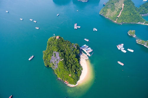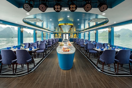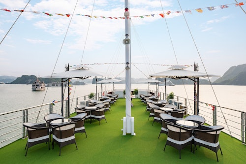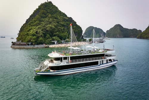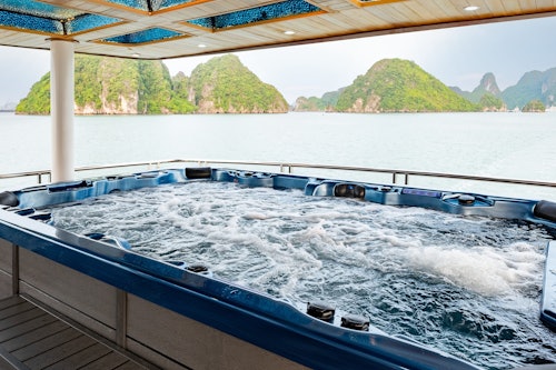 Faites une croisière dans la baie de Hạ Long, en commençant par un déjeuner à bord de la croisière. Vous visiterez ensuite la grotte Sung Sot, où vous pourrez explorer et faire du trekking dans la grotte. Ensuite, vous vous rendrez à la grotte de Luon pour essayer de faire du kayak ou profiter d'une balade en bateau en bambou. Votre prochaine étape est l'île de Titop, où vous pouvez choisir de nager, de faire de la randonnée ou simplement de vous détendre. Terminez votre journée par une pause au coucher du soleil, en dégustant des cocktails, des en-cas et des fruits frais.