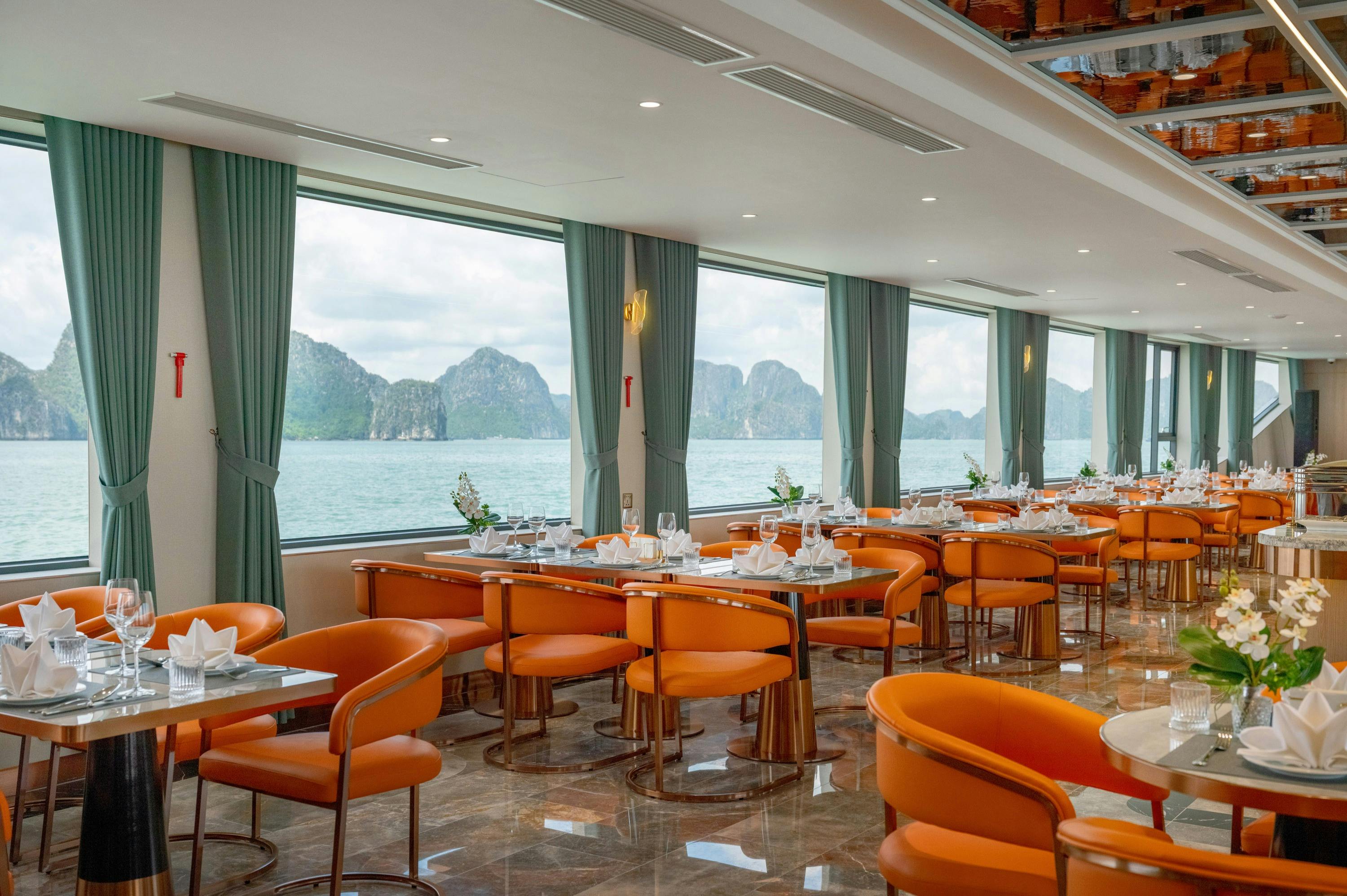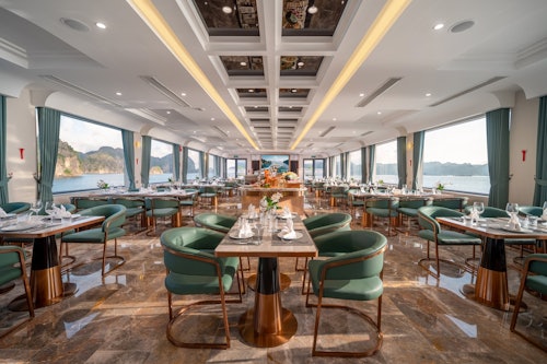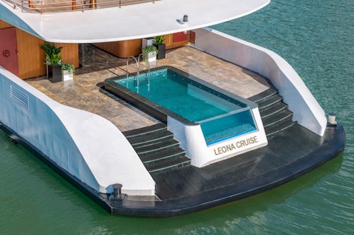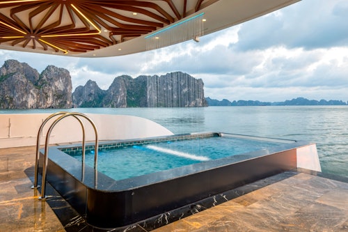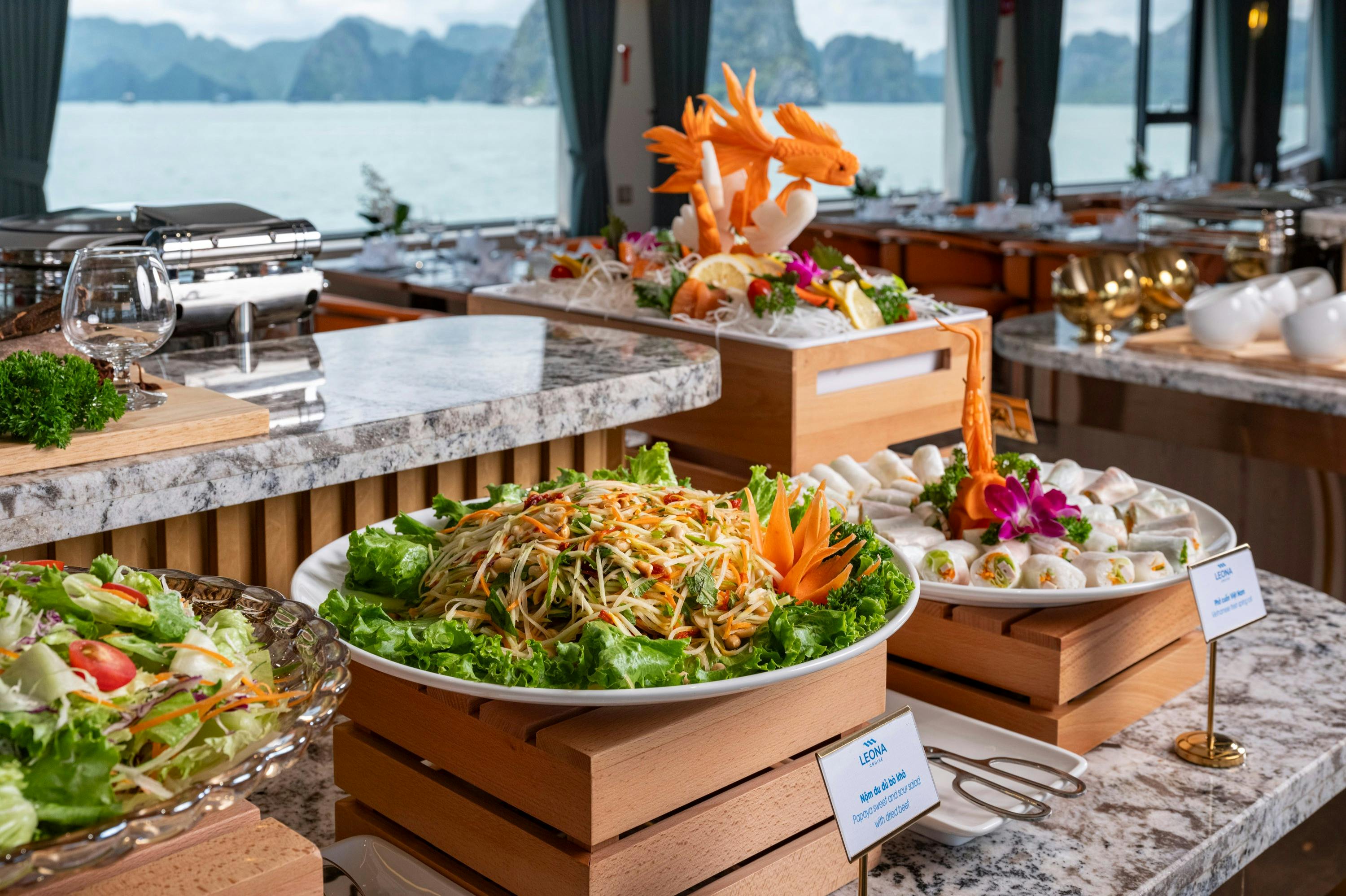 Embarquez à bord de la croisière 5 étoiles Leona pour une excursion d'une journée dans la baie d'Ha Long, classée au patrimoine mondial de l'UNESCO. Commencez par un verre de bienvenue avant de passer devant des formations calcaires et de déjeuner au restaurant du bord. Kayak ou bateau en bambou dans l'arche de la grotte de Luon, observation des stalactites de la grotte de Sung Sot (surprenante), et détente ou randonnée jusqu'au point de vue de l'île de Titop. Terminez par une soirée au coucher du soleil alors que le bateau navigue le long de zones pittoresques avant de retourner au port.