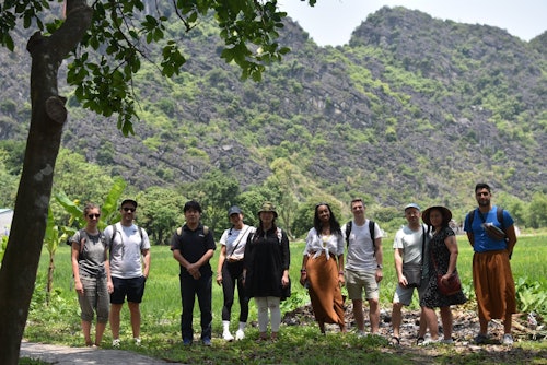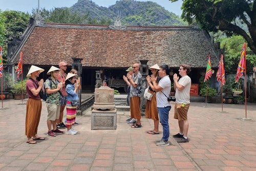 Prise en charge à l'hôtel dans le vieux quartier et départ pour la province de Ninh Binh. Visite de Hoa Lu, l'ancienne capitale royale du Vietnam, avec notamment le temple du roi Dinh et le temple du roi Le. Continuez ensuite vers Tam Coc, situé à 10 kilomètres de Hoa Lu. Vous atteindrez la grotte de Mua et gravirez 500 marches jusqu'au sommet de la montagne de Mua, d'où vous aurez une vue sur la région de Hoa Lu. Déjeuner dans un restaurant local avant d'embarquer sur un bateau en bambou conduit à la rame par les habitants sur la rivière Hoang Long. Vous traverserez Tam Coc, trois grandes grottes, des pêcheurs locaux, des villages riverains et des formations calcaires. La promenade en bateau dure environ deux heures. Montez dans le bus pour retourner à Hanoi, où votre voyage s'achèvera.