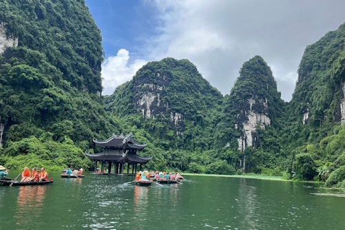 Prise en charge par le guide et départ pour la province de Ninh Binh, avec une courte pause de 15 à 20 minutes pendant le trajet. À l'arrivée, visite de Hoa Lư, ancienne capitale du Vietnam de 968 à 1010, et découverte de l'histoire du Vietnam sous les dynasties Dinh, Le et Ly. Déjeuner buffet composé de plats locaux tels que viande de chèvre, poisson, poulet et riz frit. Des options végétariennes sont également disponibles. Faites une promenade de 2,5 heures en bateau de bambou à travers Tam Coc, où vous passerez devant des rizières, des rivières et un système de grottes souvent appelé "la baie d'Ha Long sur la terre ferme". Faites le tour du village à vélo pendant 45 minutes pour observer la vie locale. Dirigez-vous vers la grotte de Mua, où vous pourrez monter près de 500 marches pour profiter d'une vue imprenable. Retour à Hanoi et installation à votre hôtel dans le vieux quartier.