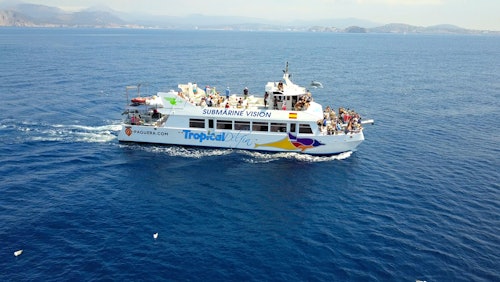 Immergiti nel mondo dell'oceano con un'esperienza unica in mare, a bordo di un catamarano con visione subacquea. * Durante questa crociera di avvistamento delfini da Peguera, potrai osservare alcuni degli animali marini più intelligenti e stimolanti del mondo nel loro habitat naturale. Naviga lungo la costa sud-ovest di Maiorca ed entra lentamente in alto mare alla ricerca di questi agili cetacei attraverso i porti sottomarini. * Inoltre, avrai l'opportunità di fare snorkeling e immergerti nell'acqua!
