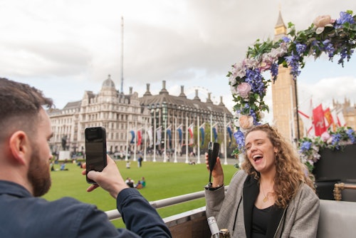 Als je op zoek bent naar rooftopbars in Londen, dan is dit een perfecte manier om je avond te beginnen. De Tootbus London Bar Bus biedt een ongeëvenaard dakterras. U krijgt de gelegenheid om de prachtige panorama's van Londen te bewonderen terwijl u ontspant met een paar drankjes. Of je nu een date hebt gepland, een avondje uit met vrienden of op zoek bent naar een originele ervaring om te delen met gasten, deze dubbeldekkerbusbar is de perfecte plek om te ontspannen en samen tijd door te brengen terwijl je Londen verkent. Met spectaculaire uitzichten, vrolijke muziek, bloemendecor en Instagram-waardige drankjes, is dit je kans om Londen te herontdekken als nooit tevoren!